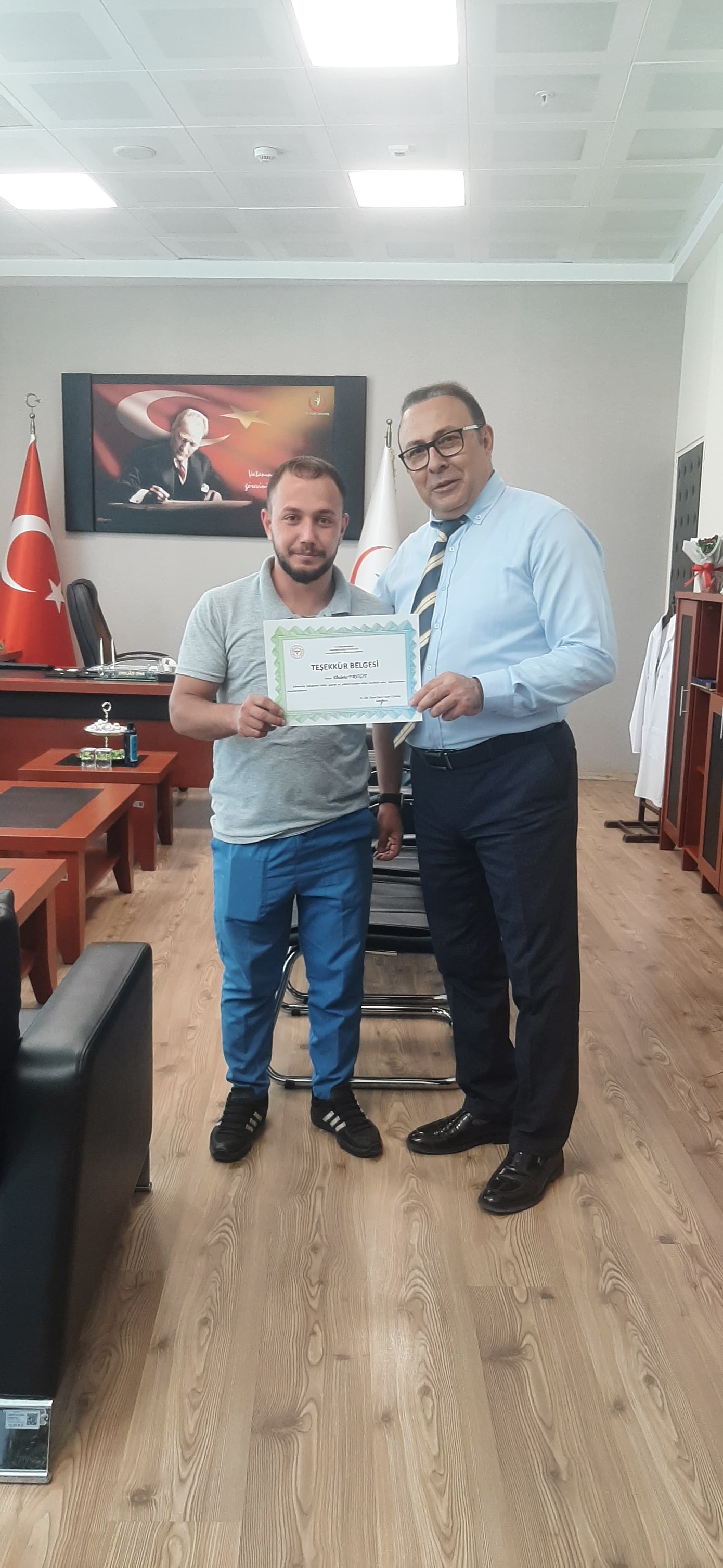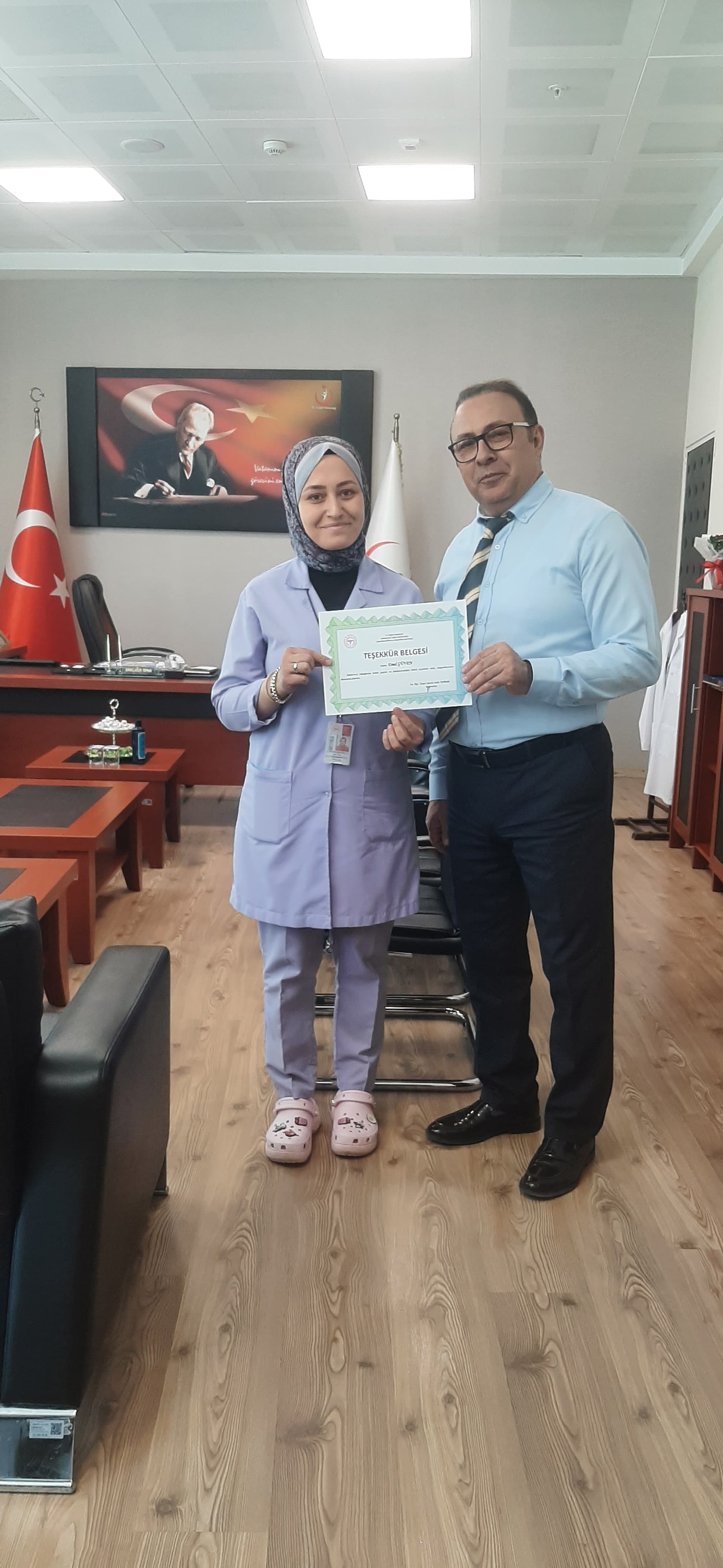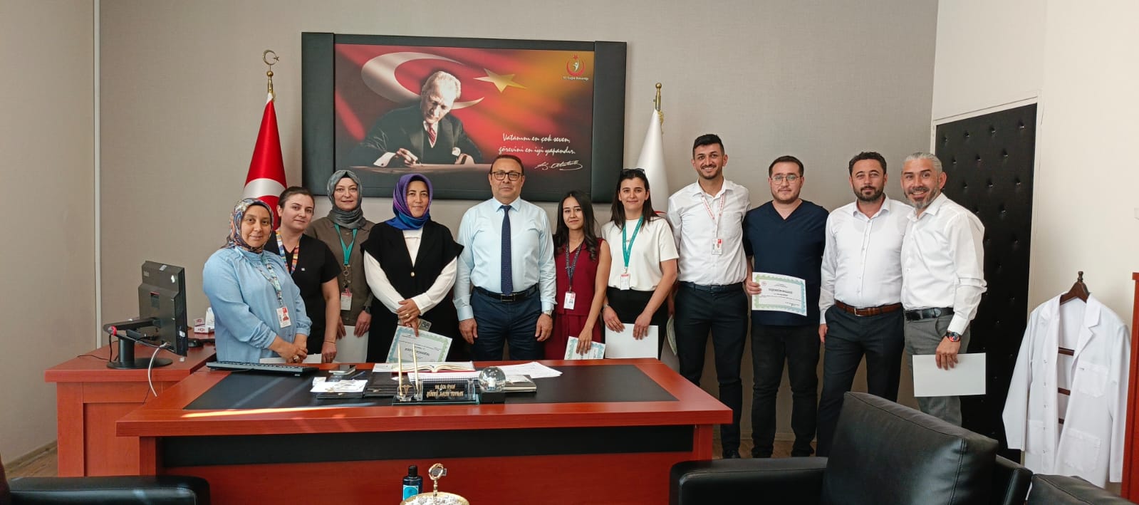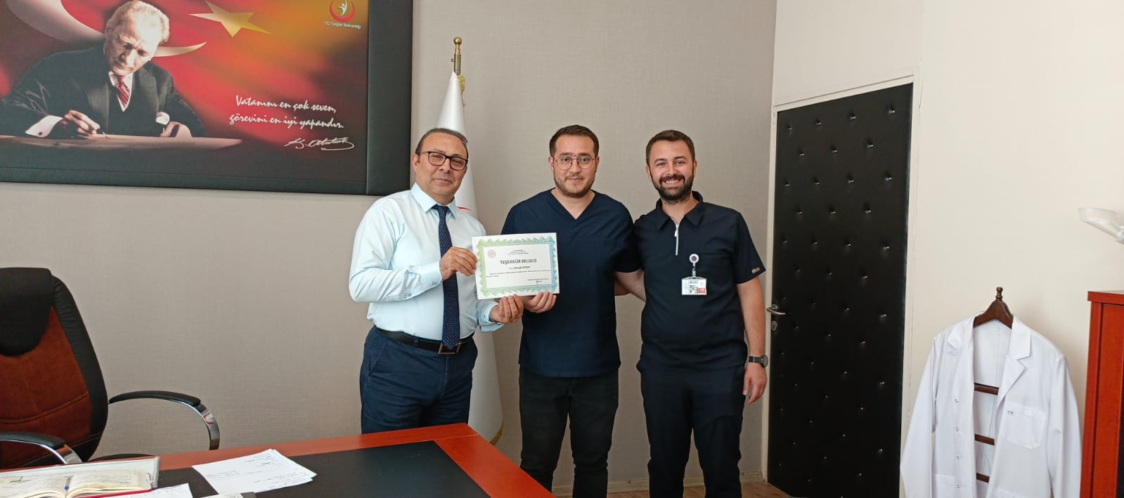 Başhekimlik makamında düzenlenen belge takdim töreninde, Başhekim Dr. Öğr. Üyesi Şükrü Salih Toprak, ilgili personele başarı belgelerini takdim etti. Başhekim Toprak, çalışanlara teşekkür ederek, hastanemizin hizmet kalitesinin artmasında önemli katkıları olan personelin özverili ve gayretli çalışmalarının devamını diledi.