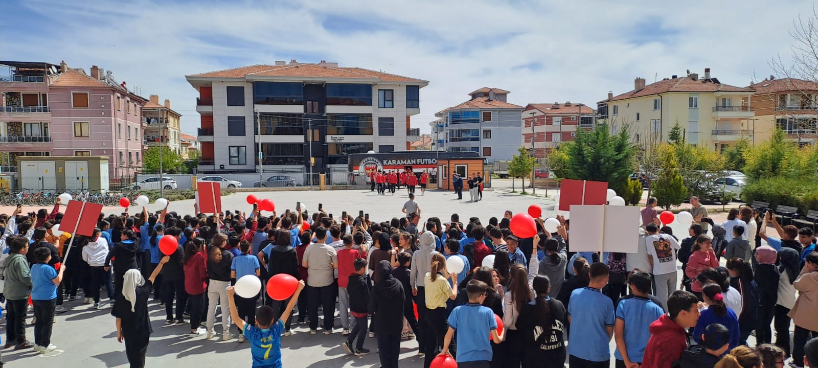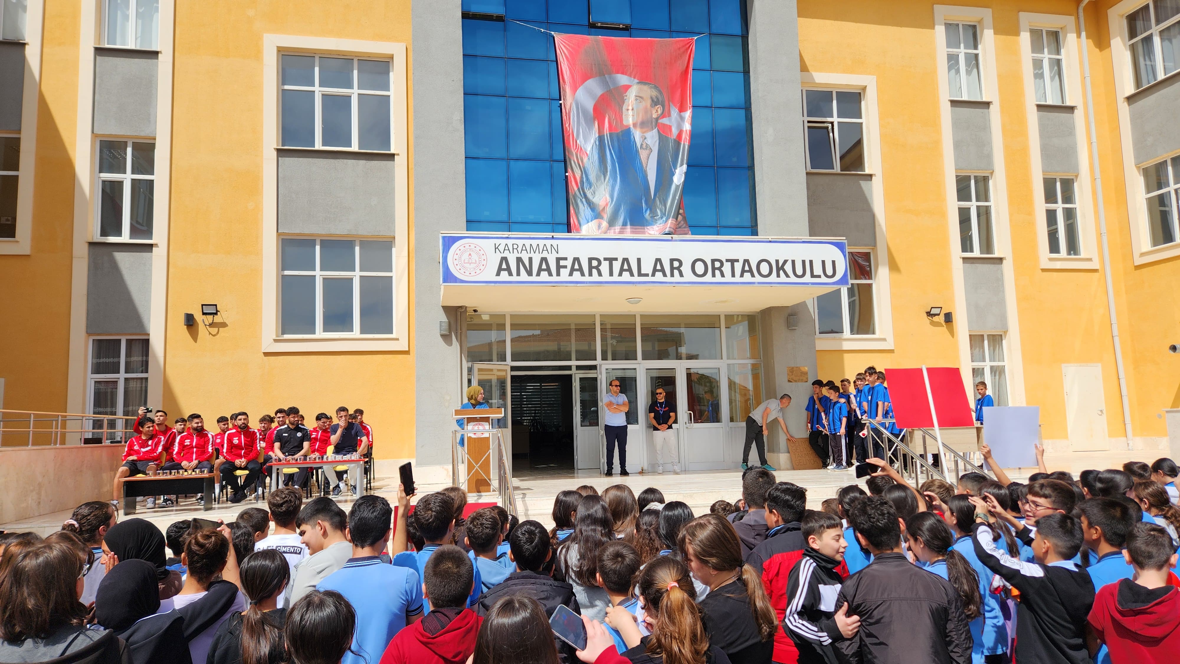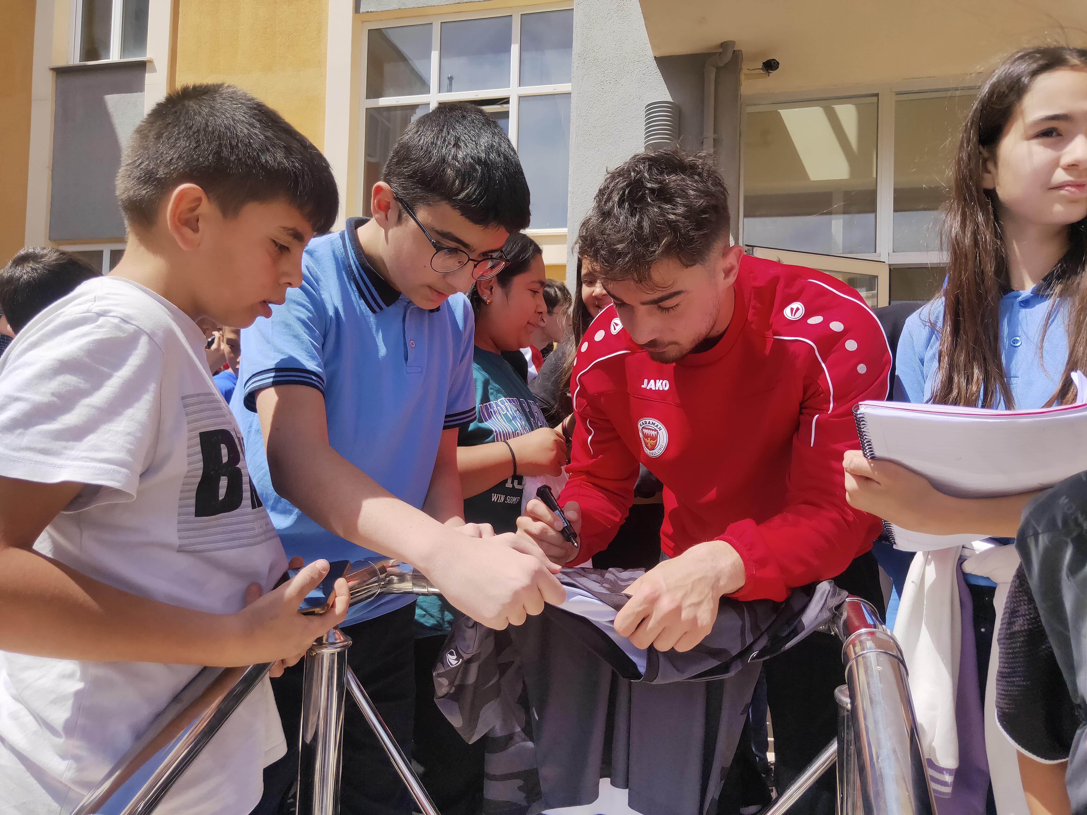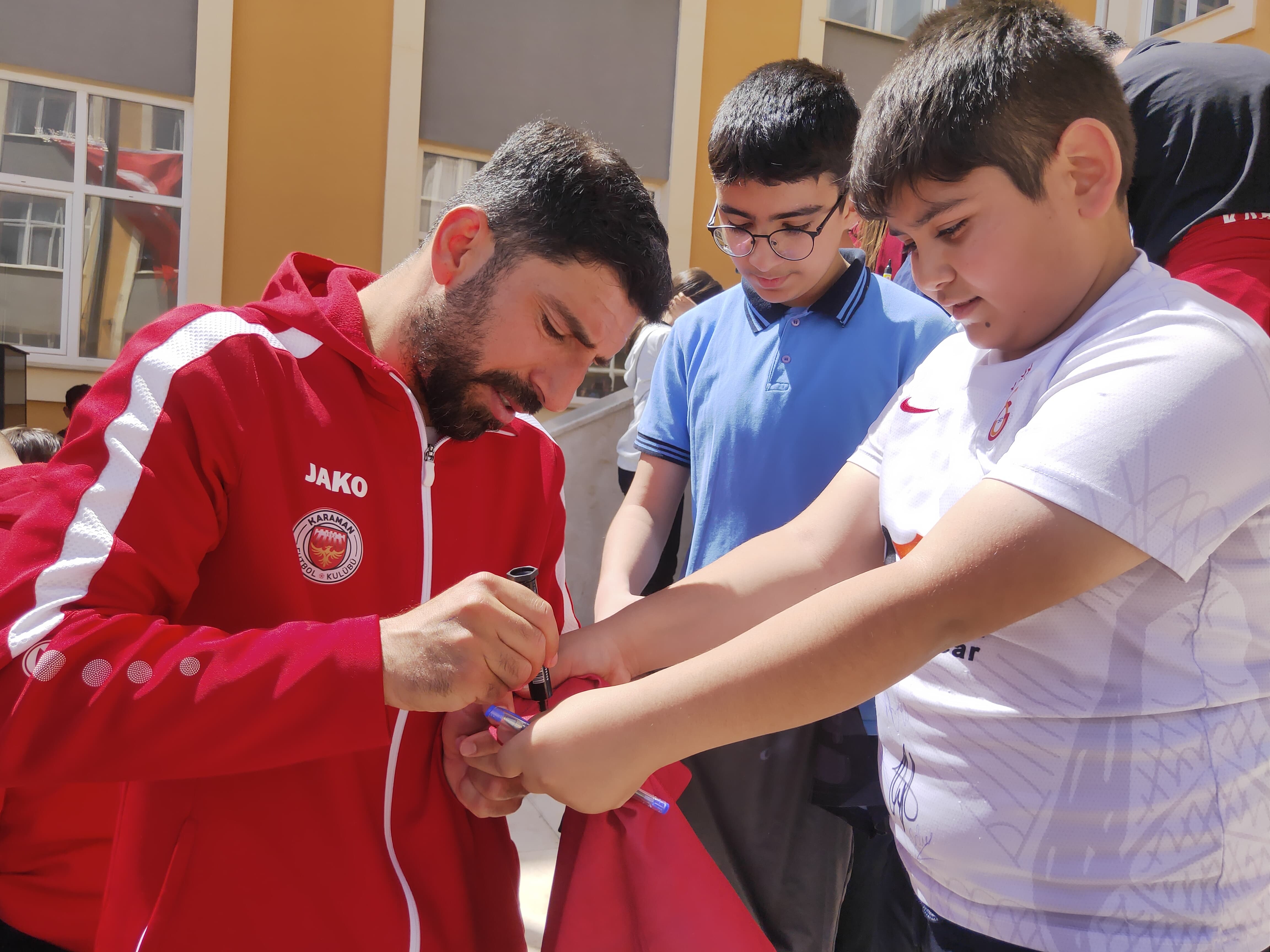 Okul bahçesinde öğrencilerin coşkulu tezahüratlarıyla karşılanan Karaman FK ekibi, öğrencilerle futbol üzerine keyifli bir söyleşi gerçekleştirdi. Söyleşide futbolcular kendi kariyer yolculuklarını paylaşırken, öğrenciler de merak ettikleri soruları sorma fırsatı buldu.