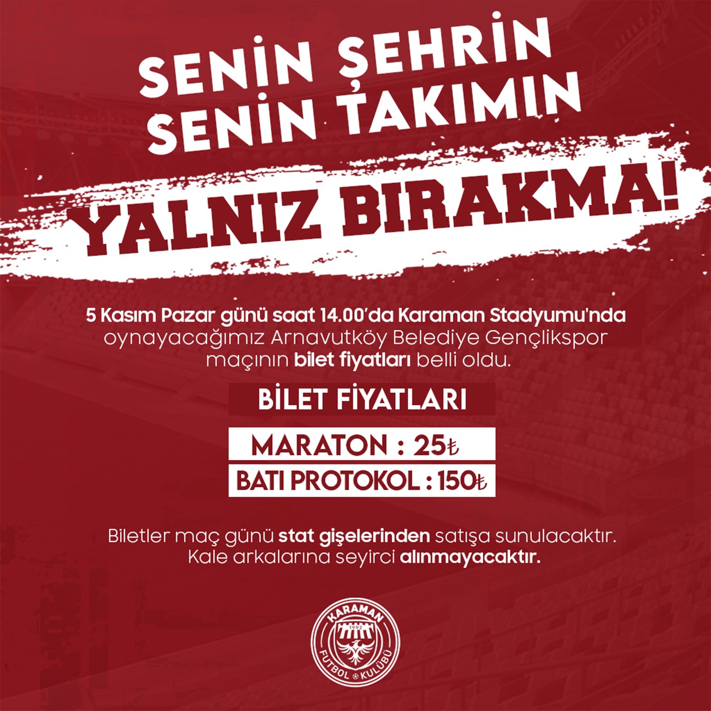 Karaman Futbol Kulübü Yönetimi Arnavutköy Belediye Gençlikspor maçı öncesi taraftara çağrıda bulundu; kulüp yönetiminden yapılan açıklamada; “Taraftarlarımız statta yerini aldığı zaman inanıyoruz ki başarı gelecektir. Karaman FK’ya gönül vermiş; her şeyin en iyisine layık olan taraftarlarımız bizi Arnavutköy Belediye Gençlikspor maçında da yalnız bırakmasınlar. Bütün taraftarlarımızı stada bekliyoruz. Biz de oynadığımız futbol ve aldığımız sonuçlarla taraftarlarımıza layık olmak istiyoruz. Bu anlayış içerisinde çok çalışıyoruz. Herkes bize güvensin. Zaman tek yürek olma zamanı, hep birlikte olma zamanı. Her zaman olduğu gibi bu pazar günkü müsabakada da yerimizi alalım.” denildi.