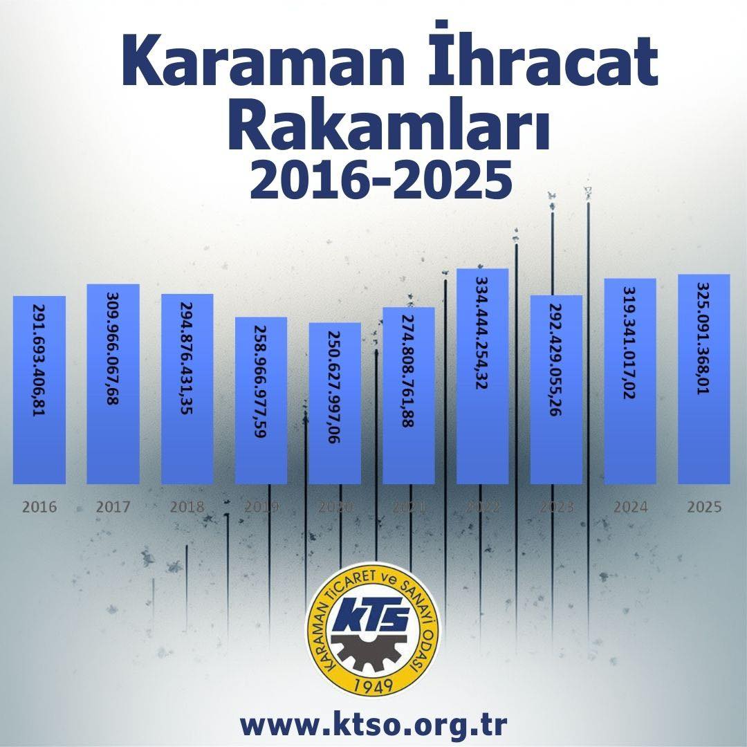 2022 yılında 334,4 milyon dolara ulaşarak önemli bir ivme yakalayan Karaman ihracatı, 2023 yılında küresel ekonomik koşulların etkisiyle sınırlı bir gerileme yaşadı. Ancak bu düşüş kalıcı olmadı ve 2024 ile 2025 yıllarında ihracat yeniden yükseliş trendine girdi. 2025 yılı itibarıyla ihracatın 325 milyon dolar seviyesine ulaşması, Karaman’ın dış ticaretteki gücünü teyit etti.