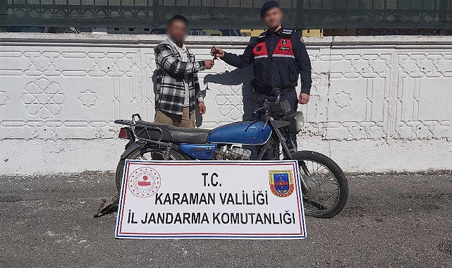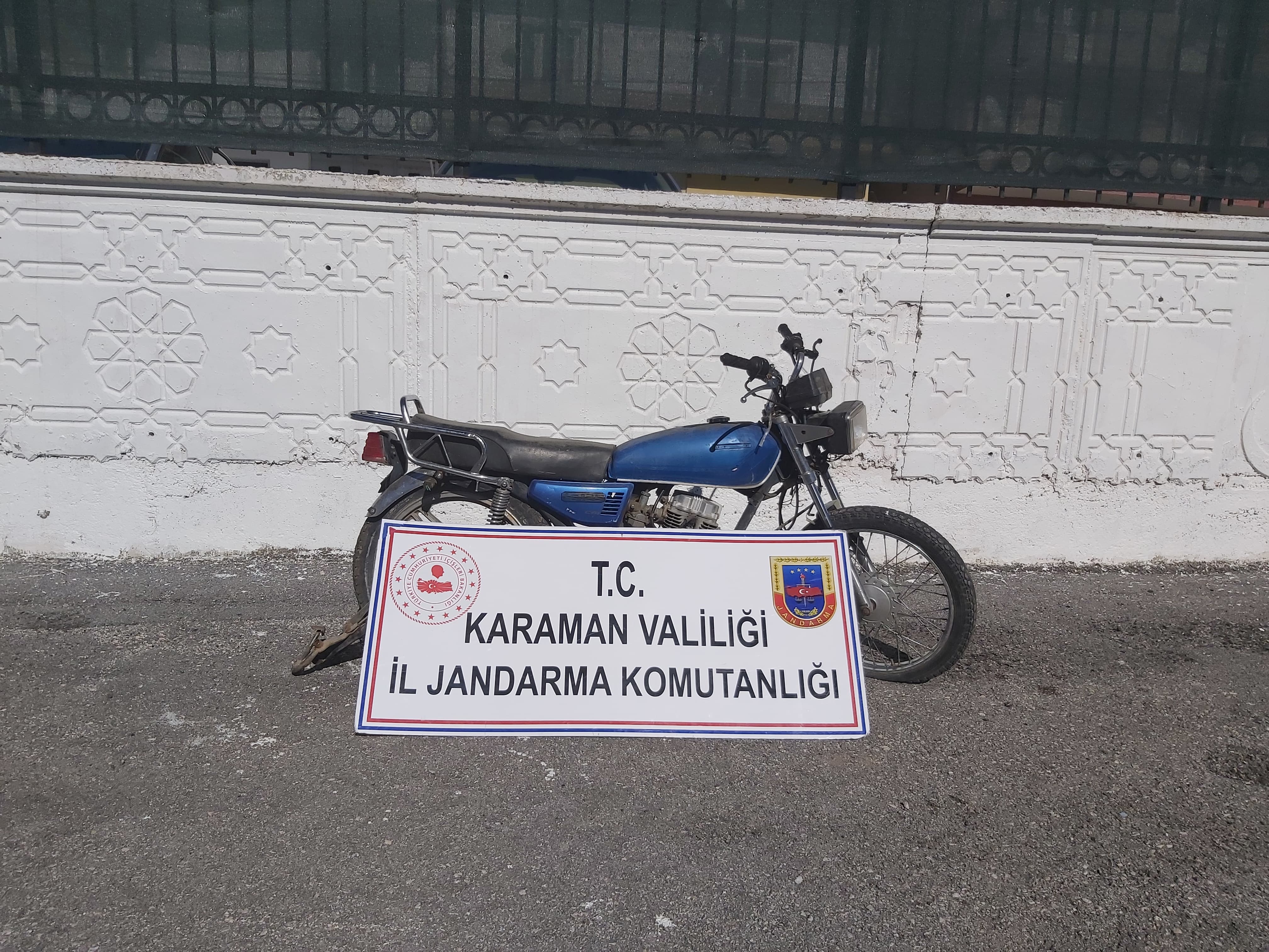 Karaman İl Jandarma Komutanlığınca yapılan istihbari çalışmalar neticesinde; Ermenek Katranlı köyünde ikamet eden (Ü.S) isimli şahsın ikametgâh adresinde çalıntı motosiklet bulunduğunun öğrenilmesi üzerine şahsın ikametgâhında yapılan adli aramada Mavi renkli, KMT Çelik marka ve plakası olmayan motosiklet bulunmuştur.