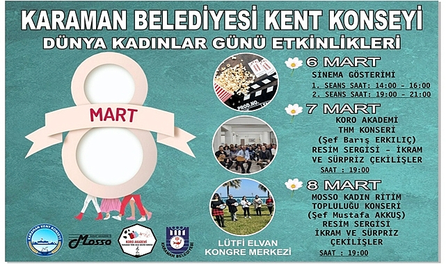 8 Mart Dünya Kadınlar günü vesilesi ile Karamanlı kadınlarımız için Karaman Kent Konseyi Kadın Meclisi’nin düzenlediği etkinliğe tüm halkımız davetlidir. Karaman Kent Konseyi Kadın Meclisi Başkanı Öznur ÇİMEN yaptığı açıklamada katılımcıların 3 gün boyunca sınırsız eğleneceği ve çekilişlerle yüzlerinin güleceği bir etkinliğin olacağını dile getirdi. Karaman Kent Konseyi Başkanı Hüseyin GERÇEK ise yaptığı açıklamada tüm kadınlarımızın kadınlar gününü şimdiden kutlayarak bu etkinlikte bulunmalarının kendisini ve bu etkinliği organize eden tüm Kent konseyi personelini mutlu edeceğini dile getirdi.