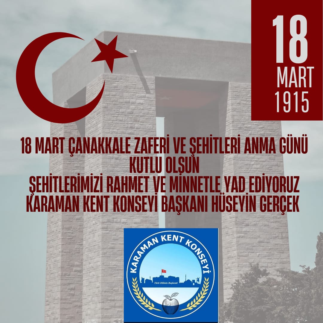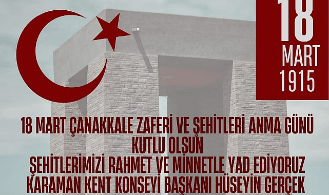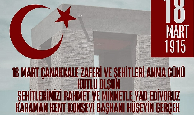 KARAMAN KENT KONSEYİ BAŞKANI HÜSEYİN GERÇEK mesajında: “Tarihimizin kırılma noktalarından biri olan 18 Mart 1915 tarihi İşgal altındaki vatanını, zorluk ve yokluğa rağmen canları pahasına koruyan kahraman ecdadımızın, vatan ve bayrak sevgisini tüm dünyaya gösterdiği şanlı zaferin adıdır.