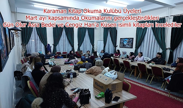 Karaman Kitap Okuma Kulübü üyeleri, Mart ayı kapsamında Okumalarını GerçekleştirdiKaraman Kitap Okuma Kulübü üyeleri, Mart ayı kapsamında okumalarını gerçekleştirdikleri Gün Olur Asra Bedel ve Cengiz Han'a Küsen isimli kitapları incelediler. Cengiz Aytmatov'un eserlerinin en belirgin özelliği, olayları efsanelerle birleştirmesidir. Değerlendirme gecesinde Fadime Akkor Karaca, Kırmızı Kartan masalıyla kitap okuma üyelerini efsaneler diyarında bir gezintiye çıkardı."Bu yerlerde trenler doğudan batıya, batıdan doğuya gider gelir… gider gelirdi…