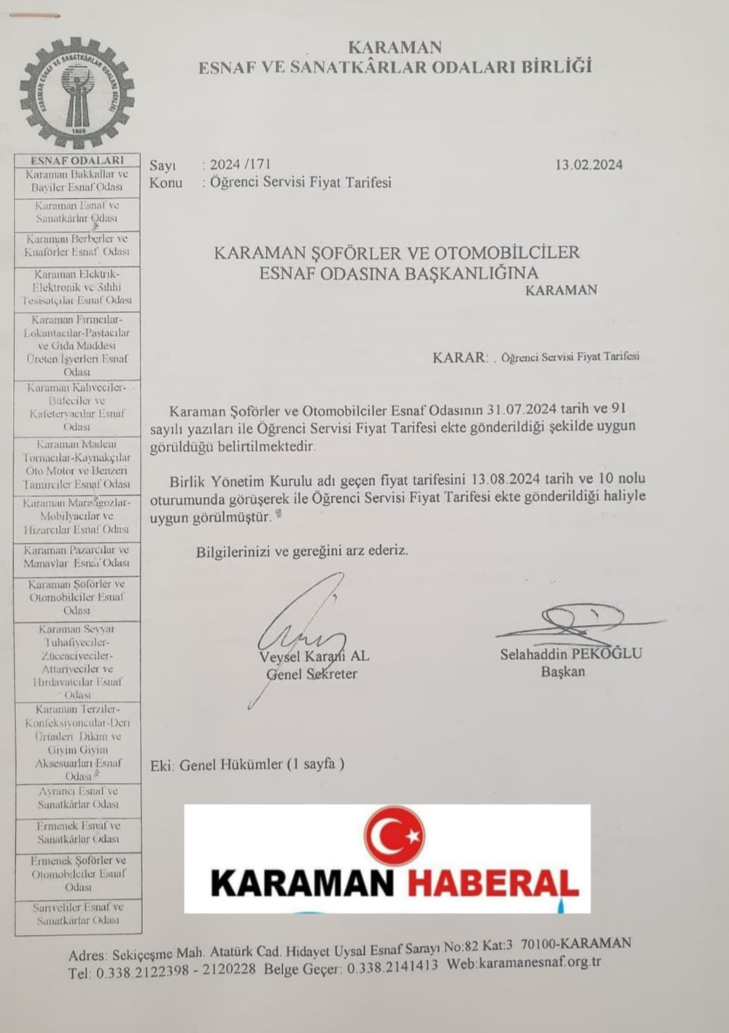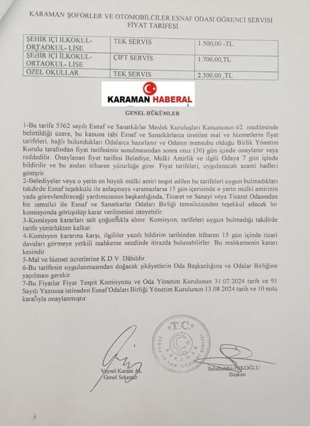 KARAMAN ŞOFÖRLER VE OTOMOBİLCİLER ESNAF ODASI, ÖĞRENCI SERVISI FİYAT TARIFESİ BELLİ OLDU.