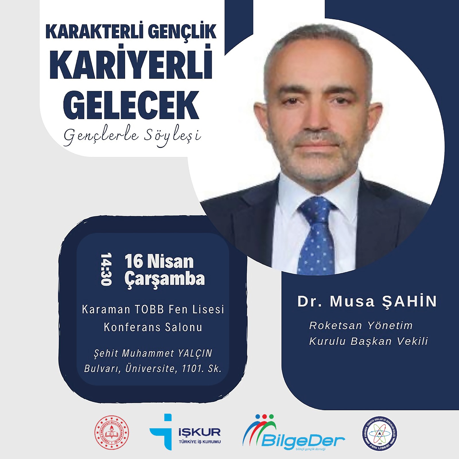 Karaman TOBB Fen Lisesi’nde Gençlik Söyleşisi GerçekleştirildiMillî Eğitim, İŞKUR il müdürlükleri ve Bilgeder'in Karakterli Gençlik, Kariyerli Gelecek projesi kapsamında düzenlediği kariyer söyleşisine Roketsan Başkan Vekili Dr. Musa Şahin konuk oldu.Programda açılış konuşmasını yapan Okul Müdürü Abdulkadir Ünüvar, gerçekleştirilen söyleşiden bahsetti. Ayrıca Roketsan'ın ülkemiz için taşıdığı değere işaret ederek bu alanda yapılan buluşmayı değerli bulduğunu ifade etti Programın moderatörlüğünü Bilgeder Başkanı Prof. Dr. Murat Öz üstlendi. Söyleşi boyunca Prof. Dr. Öz’ün sorularını yanıtlayan Dr. Musa Şahin, öğrencilere kariyer planlaması, geleceğin teknolojileri ve geleceğin meslekleri hakkında önemli bilgiler aktardı.Yoğun ilgi gören etkinlikte öğrenciler de merak ettikleri soruları yönelterek aktif şekilde programa katılım sağladı. Samimi bir atmosferde gerçekleşen söyleşi, hediye takdimi ile sona erdi.Programa Millî Eğitim Müdürü Mehmet Çalışkan, Çalışma ve İş Kurumu Müdürü Yeliz Gültekin, Milli Eğitim Müdür Yardımcısı İsmail Kılınç, Okul Müdürü Abdulkadir Ünüvar, öğretmenler ve öğrenciler de katılım sağladı.Karaman TOBB Fen Lisesi öğrencileri için faydalı bir buluşma olan bu etkinlik, gençlerin meslek ve kariyer planlamalarında önemli bir yol gösterici oldu.İl Milli Eğitim Müdürü Mehmet Çalışkan'ın Sayın Şahin'e hediye takdimi ile program sona erdi