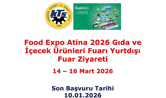 Karaman Ticaret ve Sanayi Odası (KTSO) tarafından, 14–16 Mart 2026 tarihleri arasında Yunanistan’ın Atina kentinde, Metropolitan Expo Fuar Merkezi’nde gerçekleştirilecek olan FOOD EXPO Atina 2026 Gıda ve İçecek Ürünleri Fuarı’na iş ziyareti düzenlenecek.