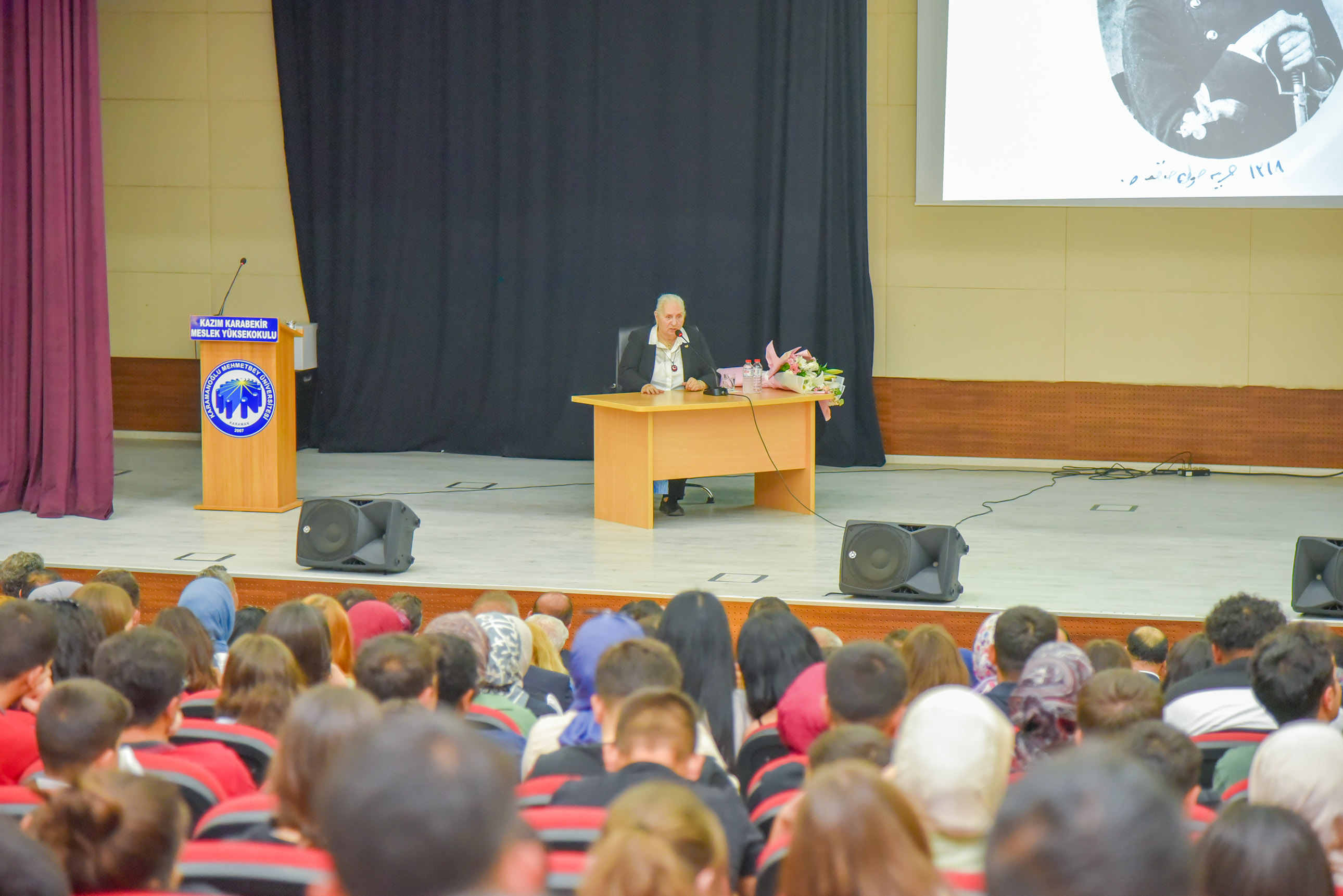 Şark Fatihi Kazım Karabekir Paşa'nın kızı Timsal Karabekir’in konuşmacı olduğu söyleşiye; Karaman Valisi Mehmet Fatih Çiçekli, KMÜ Rektörü Prof. Dr. Mehmet Gavgalı, Vali Yardımcısı Esengül Korkmaz Çiçekli, Kazımkarabekir Kaymakam V. Nural Cengiz Yamakoğlu, Kazımkarabekir Belediye Başkanı Durmuş Demir, il ve ilçe protokolü, üniversite personeli ve öğrenciler katıldı.