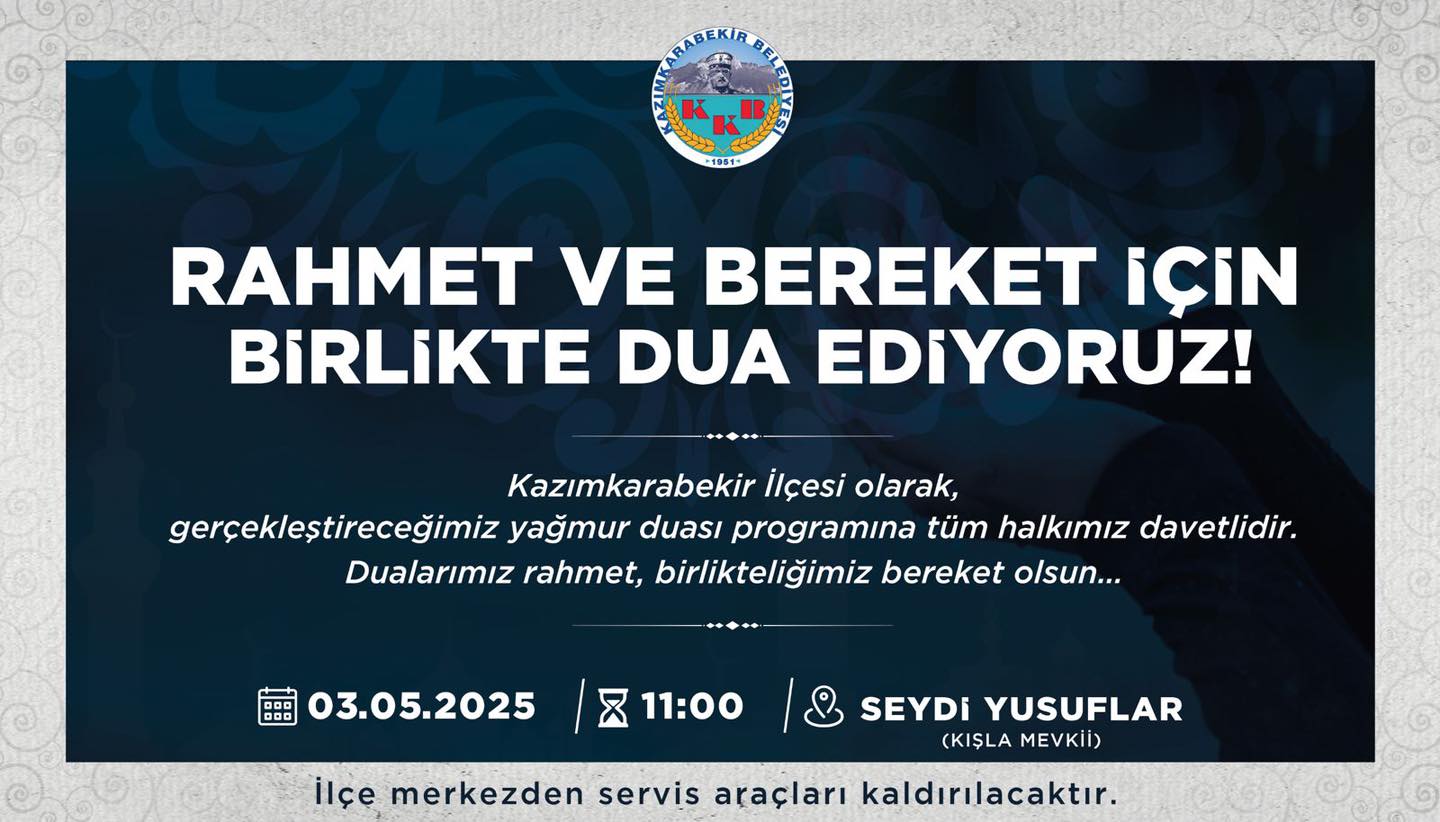 Kazımkarabekir Belediyesi Başkanlığı’ı, Seydi Yusuflar ( Kışla Mevkii) , 03.05.2025 Cumartesi, Saat : 11:00'de Şükür ve Bereket İçin Yağmur Duası Yapılacak.
