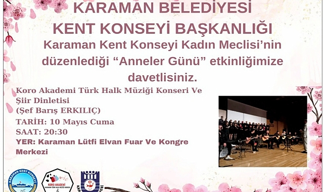 Karaman Kent Konseyi Başkanlığı tarafından Anneler Günü münasebetiyle Karaman Lütfi Elvan Fuar ve Kongre Merkezinde Anneler Günü için Özel konser düzenleyecek. Karaman Belediye Başkanı Savaş Kalaycı’nın desteği ile düzenlenecek olan etkinlik 10 Mayıs Cuma saat 20.30'da Karaman Lütfi Elvan Fuar ve Kongre Merkezi saat 20:30'da başlayacak. Ücretsiz olarak gerçekleştirilecek olan Anneler Günü Özel Konseyi’nde Koro Akademi (Karaman Türk Halk Müziği) topluluğu ve Kent Konseyi’nin ortak programı olarak hazırladığı etkinlikte anne konulu şiirler ve türküler seslendirilecek. Karaman Kent Konseyi Başkanı Hüseyin Gerçek ; “Şefkatin ve Merhametin Sembolü Tüm Hanımefendileri Davet Ediyorum” Karaman Kent Konseyi Başkanı Hüseyin Gerçek, Anneler Günü’nde yapılacak olan etkinliklere dair gerçekleştirdiği açıklamada; “Anneler Günü dolayısıyla 10 Mayıs Cuma günü Karaman Lütfi Elvan Fuar ve Kongre Merkezinde saat 20:30 'Da gerçekleştireceğimiz etkinliklerde başımızın tacı kıymetli hanımefendilerle buluşacağız. Ana bizim hep baş tacımız olmuştur. İnancımız da analarımızın ayağının altına cenneti koymuştur. İşte ana bizim için o kadar kutsal, o kadar değerlidir. Annelerimiz için çalışmaya, onların istek ve arzuları için gayret etmeye devam ediyoruz Sınırsız sevginin, hoşgörünün, iyiliğin, şefkatin ve merhametin sembolü tüm hanımefendileri Anneler Günü coşkusunu birlikte yaşayacağımız konserimize davet ediyorum. Şehit Annelerimiz başta olmak üzere kıymetli hanımefendilerin Anneler Günü’nü en içten dileklerimle kutluyorum.” Cümlelerine yer verdi.