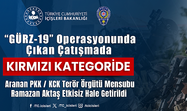 Kırmızı Kategoride Aranan PKK/KCK Terör Örgütü Mensubu Ramazan Aktaş “GÜRZ-19” Operasyonunda Çıkan Çatışmada Etkisiz Hale Getirildi.İçişleri Bakanı Ali Yerlikaya; Kırmızı kategoride aranan PKK/KCK terör örgütü mensubu Faraşin-Bedran (Kod adlı) Ramazan Aktaş Mardin’in Artuklu ilçesinde bir eve düzenlenen “GÜRZ-19” Operasyonunda çıkan çatışmada etkisiz hale getirildiğini açıkladı. Hainlere nefes aldırmayacağız. Operasyonlarımız yılın 365 günü kararlılıkla sürecek! '' ifadelerinde bulunan Bakanımız Sayın Ali Yerlikaya sosyal medya hesabından yaptığı paylaşımda ayrıca şu ifadelere yer verdi; Mardin İl Emniyet Müdürlüğünce yapılan çalışmalar sonucu; bölücü terör örgütü adına kırsal alanda faaliyet gösterdiği için kırmızı kategoride aranan ve eylem hazırlığında olan terörist silahıyla birlikte etkisiz hale getirildi. Bölücü Terör Örgütü mensubuyla birlikte: