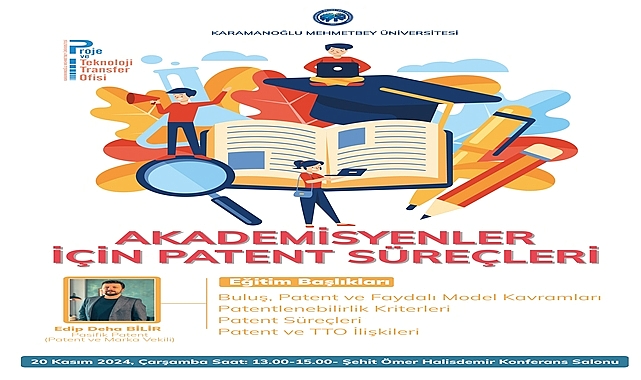 Karamanoğlu Mehmetbey Üniversitesi (KMÜ) Proje ve Teknoloji Transfer Ofisi (PTTO) tarafından, 20 Kasım 2024 Çarşamba günü “Akademisyenler İçin Patent Süreçleri” konulu bir eğitim programı gerçekleştirilecek. Şehit Ömer Halisdemir Konferans Salonu’nda saat 13.00’te başlayacak olan etkinlikte akademisyenlere patent süreçleriyle ilgili kapsamlı bilgiler sunulacak.