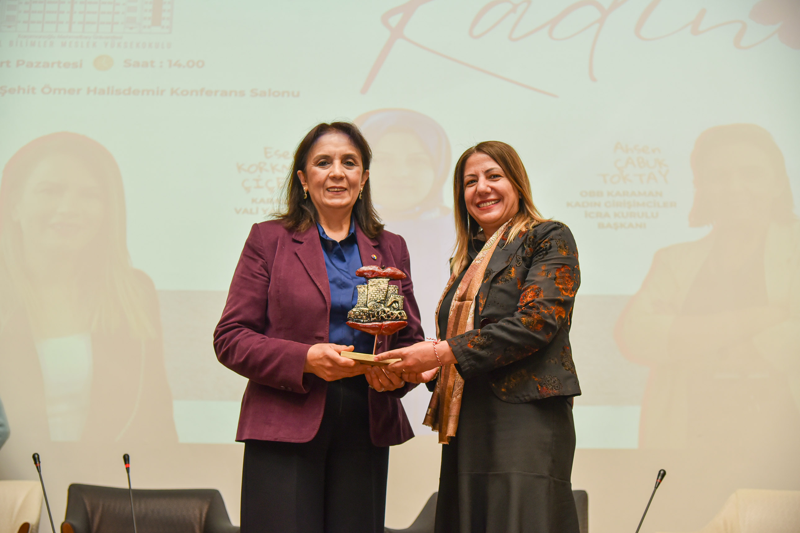 Halk oyunları gösterisi ile süren program, moderatörlüğünü SBMYO Dr. Öğr. Üyesi Pınar Yeşilçimen’in yaptığı Vali Yardımcısı Esengül Korkmaz Çiçekli, Karaman QNB Müdürü Pınar Ay Güleç ile TOBB Kadın Girişimciler İcra Kurulu Başkanı Ahsen Çabuk Toktay’ın konuşmacı olduğu söyleşi ile devam etti.