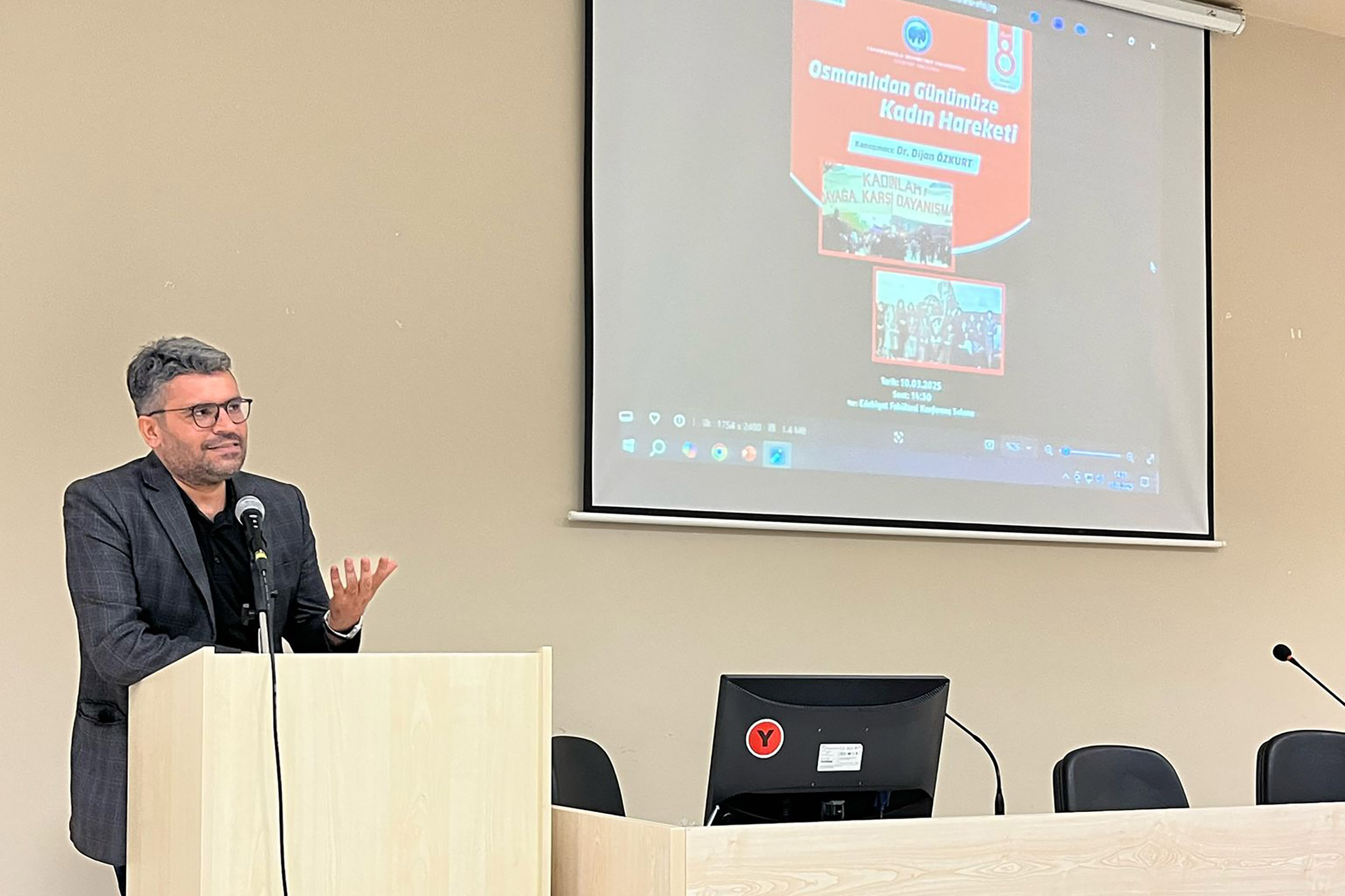 Konferansın açış konuşmasını Edebiyat Fakültesi Sosyoloji Bölüm Başkanı Doç. Dr. Mehmet Çakır gerçekleştirdi. Ardından kürsüye gelen Arş. Gör. Dr. Dijan Özkurt, konuşmasına 8 Mart’ın tarihsel sürecini anlatarak başladı. Dinleyicilere, Osmanlı döneminde filizlenen kadın hareketinin ilk adımlarını aktaran Özkurt, süreç içinde kazanılan hukuki ve siyasal haklara da değindi.