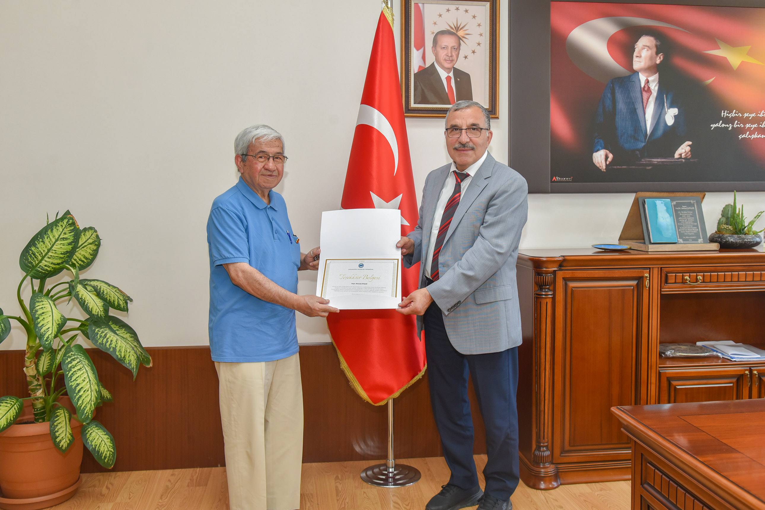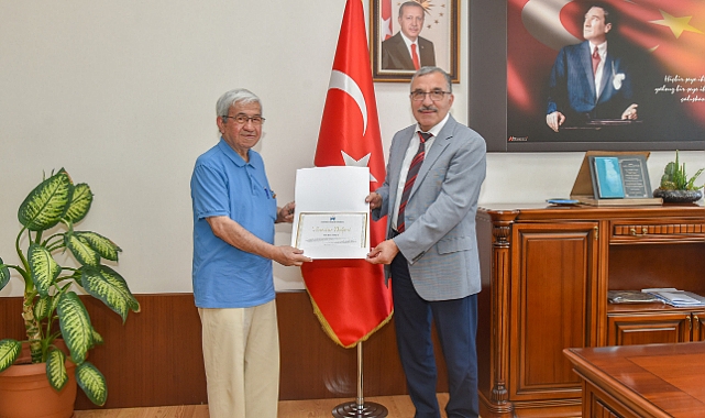 Edebiyat Fakültesi Dekanı Prof. Dr. Mehmet Mercan ile Kütüphane ve Dokümantasyon Daire Başkanı Ahmet Kahrıman’ın da yer aldığı ziyarette Rektör Gavgalı, Mustafa Koçak’a teşekkür belgesi takdim etti.