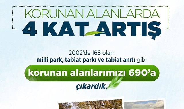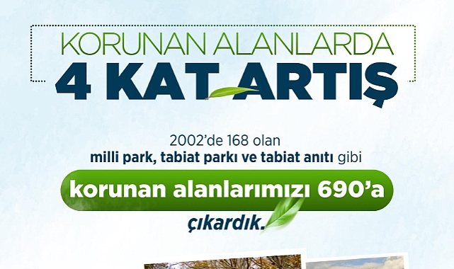 Türkiye genelinde doğal mirasın korunmasına yönelik yürütülen çalışmalar kapsamında, 2002 yılında 168 olan korunan alan sayısı dört kat artırılarak 690’a yükseltildi.