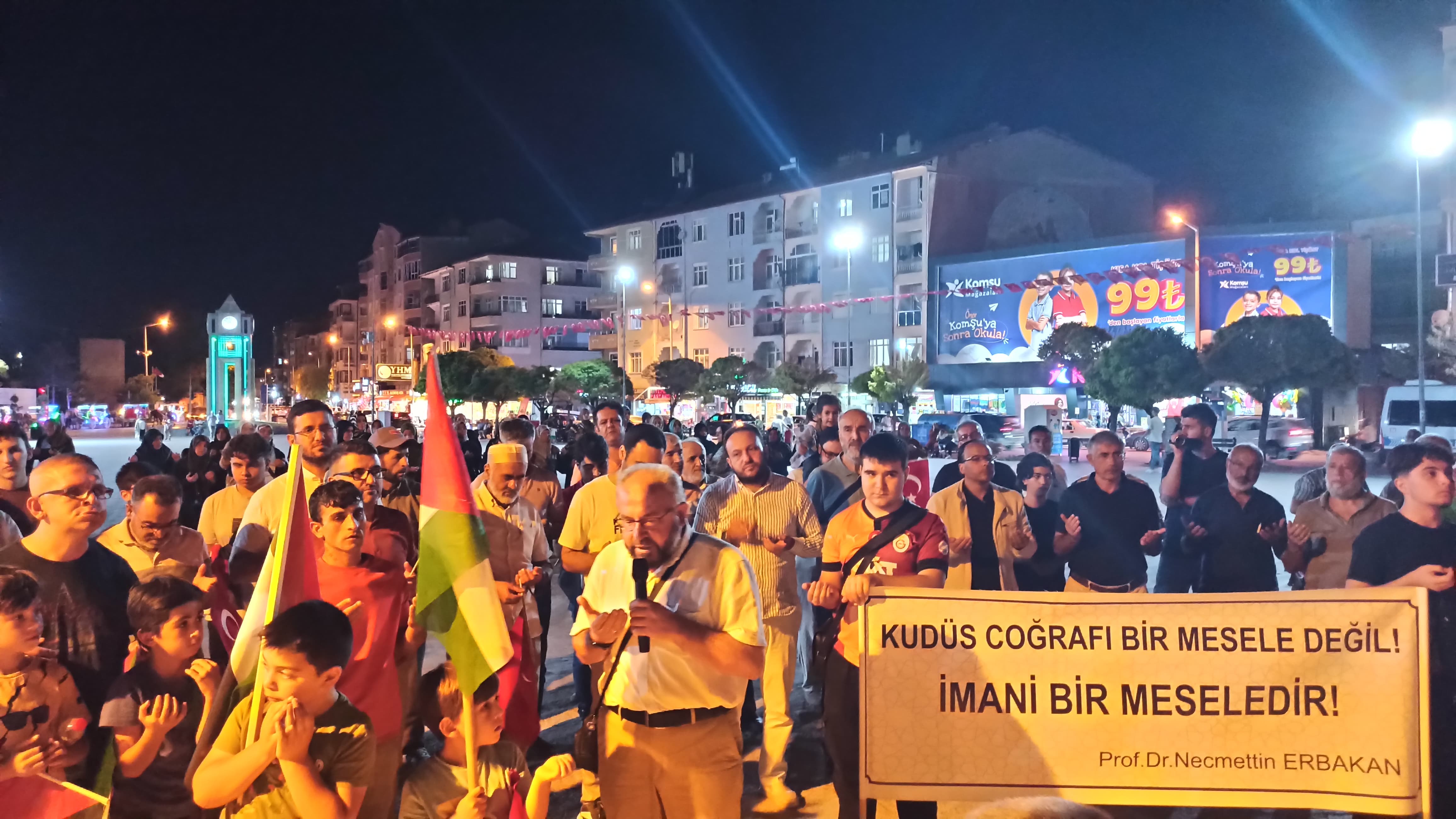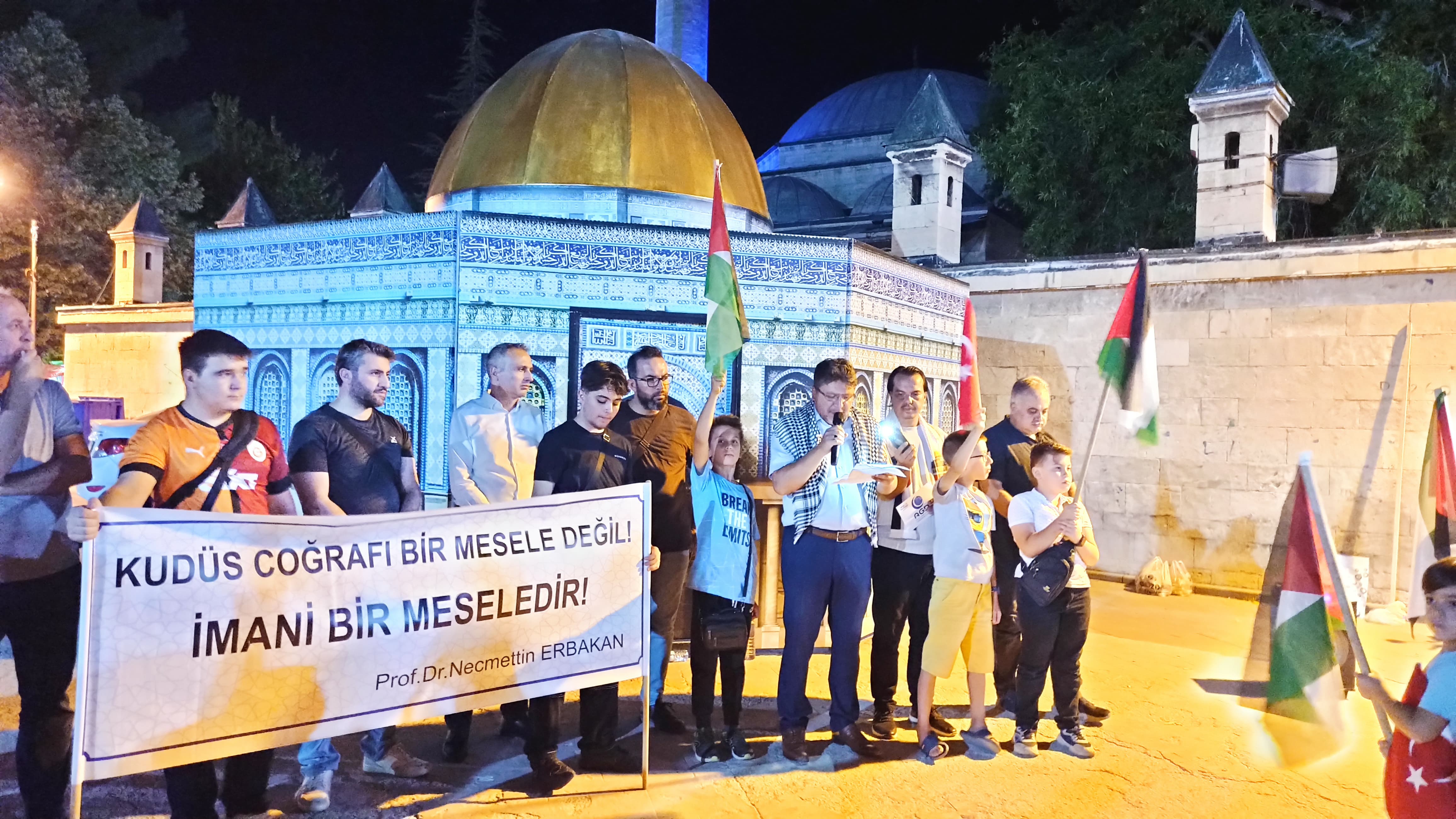 “Hak-Batıl mücadelesi Hz. Adem’den bu yana devam ediyor. Bugün batılın beyni konumundaki siyonizm Gazze’de tam da kendisine yakışan bir biçimde alçakça ve vahşice katliamlarına devam ediyor. Siyonistler masum sivillere bomba yağdırırken Hamas ise Kassam Tugayları ile israil tanklarını ve askerlerini tek tek avlayarak adeta destan yazıyor.. Sözün burasında soruyoruz: Kim terörist? ...Filistin, kavmiyet hesabı yapanların, mezhep hesabı yapanların; çıkar, koltuk ve statü hesabı yapanların davası olamaz. Filistin direnişi reel politikçilerin davası olamaz. Filistin direnişi bu putları yıka yıka İsrail’i yıkacaktır. Eğer bu putlardan birine meyliniz varsa bilin ki Filistin direnişine ya düşmansınız ya da düşman olacaksınız. ...Biz zafere inanıyoruz. Hem de sonuna kadar inanıyoruz. Ancak aylardır siyonizme karşı adeta şeytanla göğüs göğüse çarpışan mücahitlere artık dua etmeyi bile çok görür hâle geldik. Unuttuk, alıştık, sıradan hayatımıza, gündemimize geri döndük. Her gün en azından dualarımızla mücahitlere destek olmazsak yarın zafere ulaşıldığında hangi yüzle sevineceğiz? Gazze’yi, Filistin’i, Çin zulmü altında kültürleri ortadan kaldırılmaya çalışılan Uygur Türklerini, Keşmir’i, Arakan’ı unutamayız. Aktekke Meydanına kurmuş olduğumuz bu sembolik Kubbetüs Sahra çadırı ile gönlümüzün mazlumlardan yana olduğunu gösterme istedik. Burada tutacağımız nöbetlerle, düzenleyeceğimiz etkinliklerle kalbimizin mazlumlarla atmasını sağlamaktır niyetimiz.