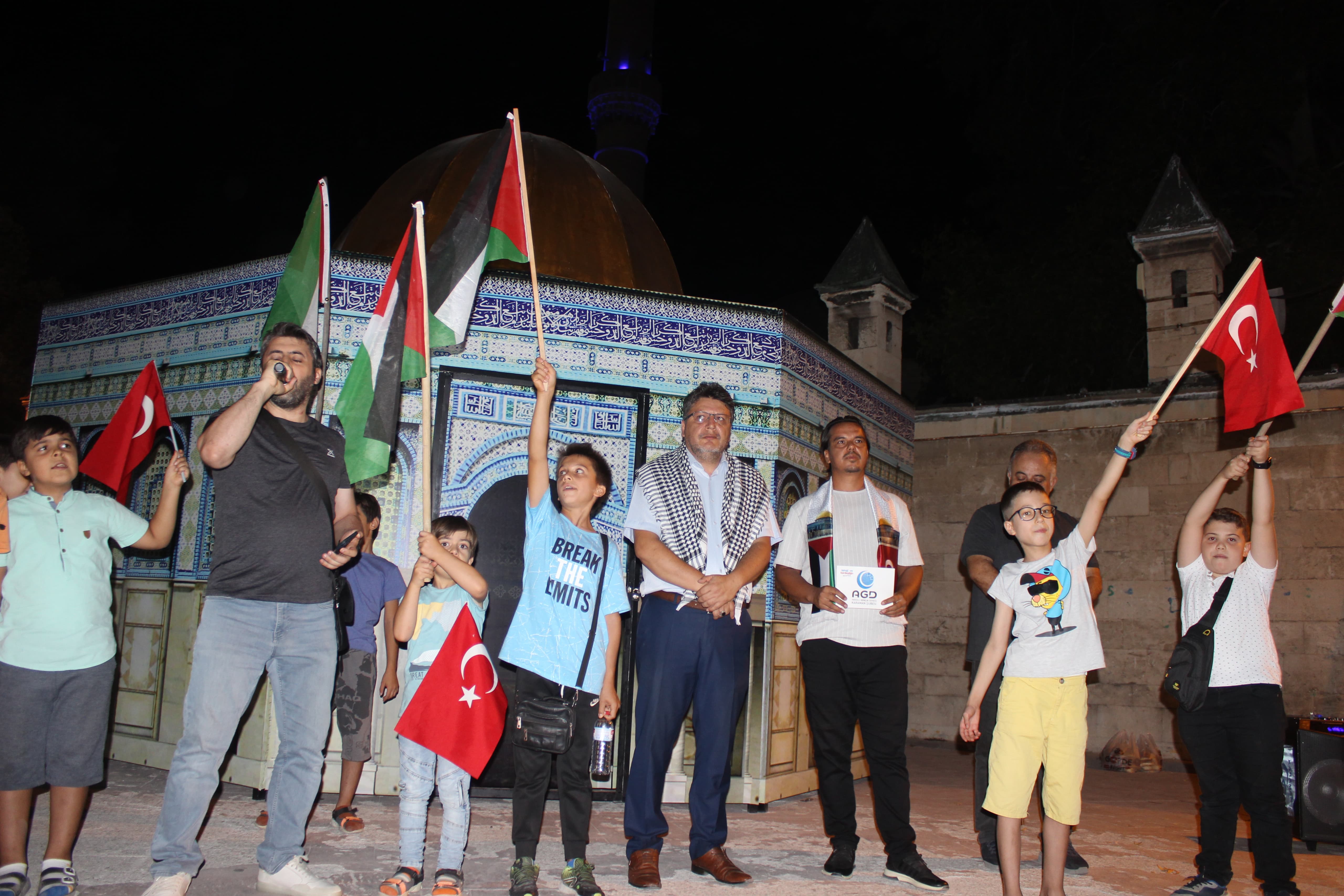 Düşünün! Kudüs’teyiz. Gözlerimizde sevinç gözyaşları, kalbimiz yerinden çıkacak gibi.Mescid-i Aksa’nın bahçesinde muazzam bir kalabalık. 57 İslam ülkesi birleşmiş ve Kudüsözgürlüğüne kavuşmuş. Mescid-i Aksa’nın minberinden İslam Birliği deklarasyonu ilan ediliyor. İşte o gün ak olacak olan yüzler bugün kalpleri mazlumlarla atanların, bugün üzerine düşeni yapanların yüzleri olacaktır. “ Basın açıklamasından sonra AGD Karaman Şubesi eski başkanlarından Tevfik Baran tarafından dua yapıldı ve sanatçı Fatih Budak, Filistin ezgisi seslendirdi. Aktekke Meydanında bulunan vatandaşlar çadır içerisindeki sergiyi gezerek etkinlik hakkında bilgi aldılar. Önümüzdeki günlerde Kubbetü’s Sahra Çadırında sergi, söyleşi, sinevizyon gösterimi gibi birçok etkinliğin yapılması bekleniyor.