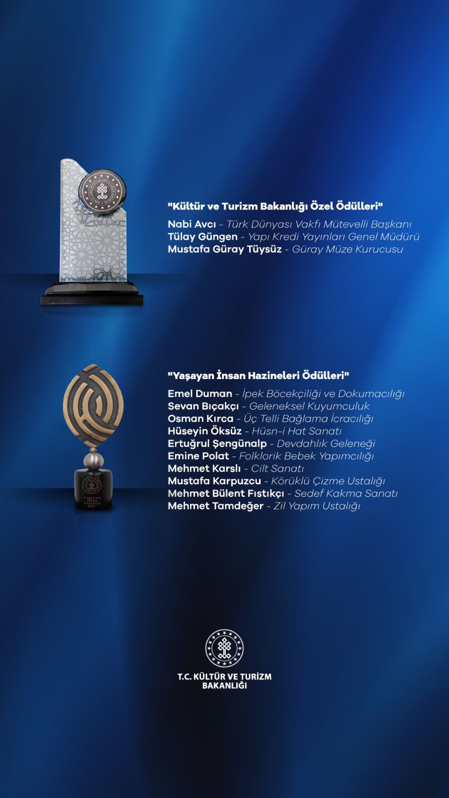 Gelenekten geleceğe uzanan kültür köprüsünü ayakta tutan ustalar ve sanatçılara verilen ödüllerle, Türkiye’nin zengin kültürel birikiminin korunması ve yaşatılmasına yönelik irade bir kez daha güçlü şekilde ortaya kondu.