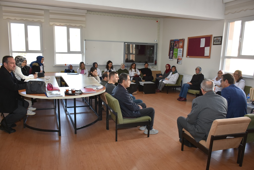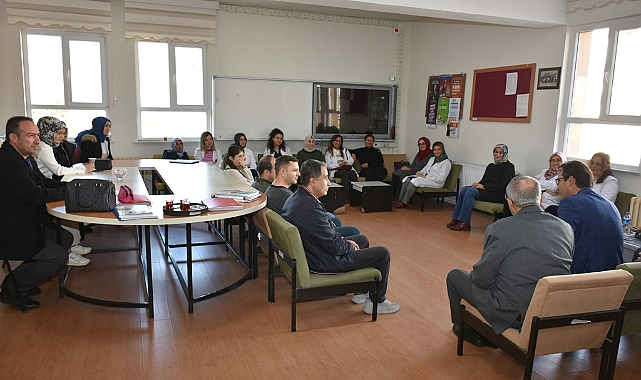 İl Millî Eğitim Şube Müdürü Şahin Yeter’in eşlik ettiği ziyarette, ilk olarak Sabiha Gökçen Ortaokulu öğretmenleriyle öğretmen odasında bir araya gelen İl Millî Eğitim Müdürü Mehmet Çalışkan, LGS Sınavı’nda Türkiye şampiyonu çıkartan okul idareci ve öğretmenlere teşekkür etti.