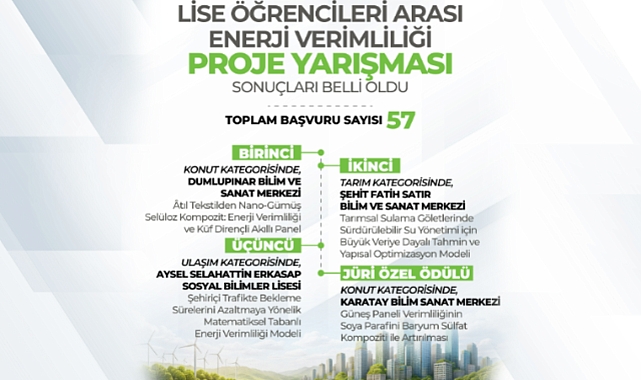 Enerji ve Tabii Kaynaklar Bakanlığı ile Türkiye Bilimsel ve Teknolojik Araştırma Kurumu (TÜBİTAK) iş birliğinde düzenlenen Lise Öğrencileri Arası Enerji Verimliliği Proje Yarışması’nın sonuçları açıklandı.