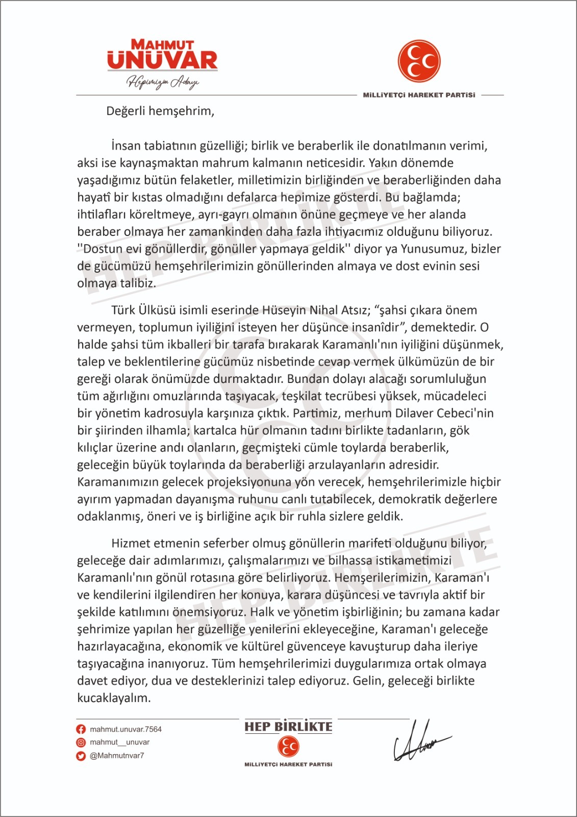 Ünüvar’ın ‘’Gelin, geleceği birlikte kucaklayalım’’ diyerek Karamanlılara çağrı yaptığı mektubunda şu ifadelere yer verildi;