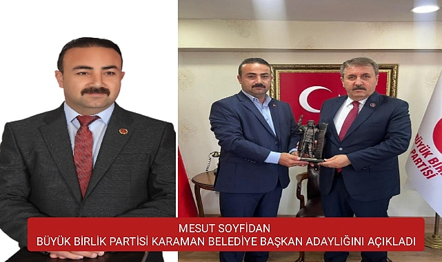 BÜYÜK BİRLİK PARTİSİ BELEDİYE BAŞKANLIĞI ADAYLIK AÇIKLAMASI BÜYÜK BİRLİK PARTİSİ KARAMAN BELEDİYE BAŞKAN ADAYI MESUT SOYFİDAN: "Değerli Karamanlı hemşerilerim; kısa bir süre önce Büyük Birlik Partisi İl Başkanlığı görevini üstlendim. Bu kısa süre içerisinde hem teşkilatlandık hem de 14 Mayıs Milletvekili seçimlerine aday olduk, Partimiz adına İlimizde çok güzel çalışmalar yaptık. Türkiye genelinde ilk dört içerisinde yer aldık. Buradan ekip arkadaşlarıma ayrı ayrı teşekkürlerimi sunuyorum. Şehit liderimiz Rahmetli Muhsin YAZICIOĞLU'nun kurucusu olduğu, Genel Başkanımız Sayın Mustafa DESTİCİ ile birlikte 30.yılını devirmiş bir partiyiz. Kurulduğu günden bu güne kadar tek kuruş hazine desteği almayan, Mecliste olduğu dönemde de aldığı hazine desteğini Şehit ailelerine bağışlayan kendi imkânları ile siyaset yapan bir partinin neferiyim. Yaklaşık 20 yıldır ilimize siyasi anlamda hiç bir çıkar ve menfaat gütmeden hizmet ettim. Bundan sonraki süreçte de hizmet etmeye devam edeceğim. Özetle toparlayacak olursak, Karaman Belediye Başkanlığı adaylığı için göreve talip oldum. 20 yıllık siyasi tecrübem, okuduğum Altı Üniversite ile birlikte, Siyaset Bilimi ve Kamu Yönetimi Dalında Yüksek Lisansımı tamamladım. Her anlamda tecrübe kazandım. Ticari hayatımda 3 yıl üst üste vergi rekortmeni oldum. İki ayrı Okulda Okul Aile Birliği Başkanlığı yaptım. Karaman Futbol Kulübü Yöneticiliği yaptım. Karmoff OFF – ROAD Kulübü Üyesiyim. Birçok STK da görev yapmaktayım ve üyesiyim. Yaklaşık 5 yıldır işçi sendikalarının Başkanlığını yapmaktayım. İşçinin emekçinin alın teri ne demektir bilirim. Belediyede çalışan bütün kardeşlerimize Kamu Çerçeve Protokolünü uygulayacağım. Şehircilik anlamında İlimize vizyon kazandıracak, yaklaşık 5 yıl önce hazırlamış olduğum projelerim var. Karaman Halkımızın takdiri ile bize yetki verilirse bu projelerimizi hayata geçireceğiz. Önemli olan Şehirleşebilmek, alt yapısıyla üst yapısıyla üretkenliği ile markalaşmak. İşte biz bunları şehrimizin dinamikleri ile birlikte başaracağız. Vatandaş ayrımı, siyasi görüş gözetmeksizin bütün hemşerilerimizin Belediye Başkanı olacağım. Bütün vatandaşlarımıza sevgi ve saygılarımı sunuyor, muhabbetle selamlıyorum" ifadesini kullandı.