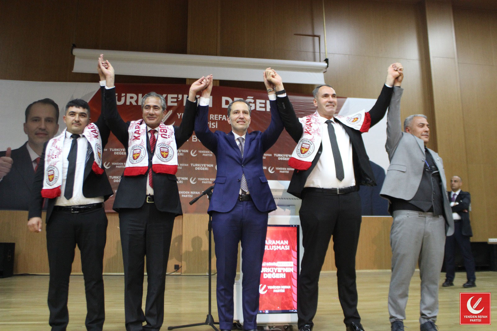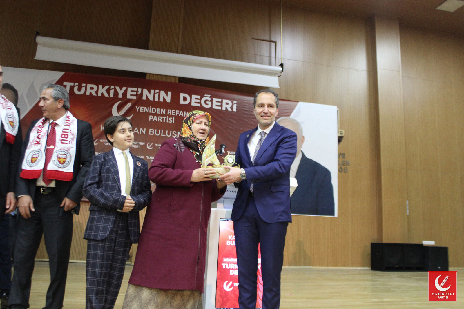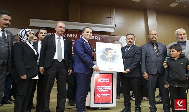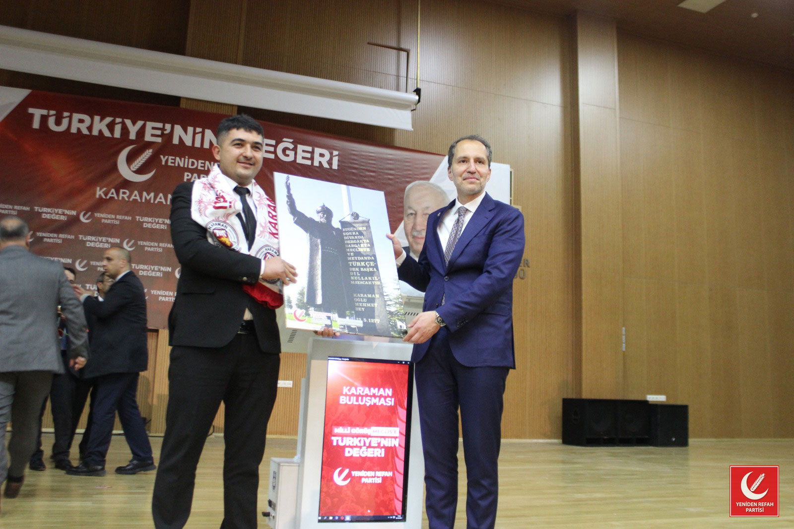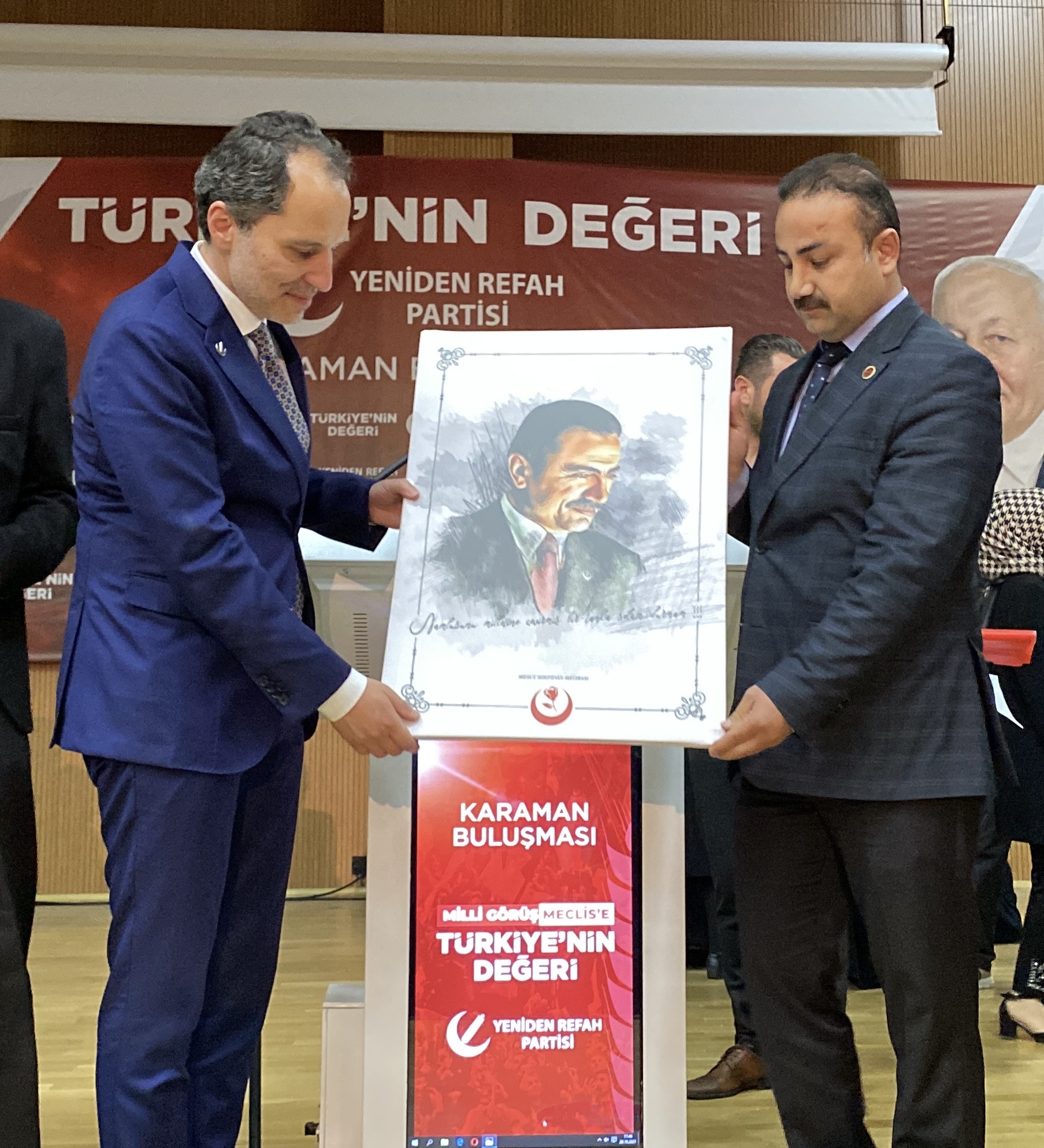 Büyük Birlik Partisi Karaman 1. sıra milletvekili adayı Mesut Soyfidan, seçim çalışmaları kapsamında Karaman’da bulunan Yeniden Refah Partisi Genel Başkanı Dr. Fatih Erbakan’a şehit lider Muhsin Yazıcıoğlu’nun tablosunu hediye etti. 2023 genel seçimlerine sayılı günler kala seçim çalışmalarına hız veren siyasi partilerin programları devam ediyor. Bu kapsamda Yeniden Refah Partisi Genel Başkanı Dr. Fatih Erbakan’da Karaman’da cumhur ittifakı üyeleriyle beraber vatandaşlarla buluştu. Buluşmaya Büyük Birlik Partisi Karaman milletvekili adayları ve parti yönetimi tam kadro katılım sağladı. Genel seçimlerde neden ittifak yapıldığı konusu başta olmak üzere seçim süreci ve yaşanan güncel olaylarla ilgili bilgiler veren Erbakan’ın konuşması hediye takdimlerimin ardından son buldu. Bu sırada Büyük Birlik Partisi milletvekili adayı Mesut Soyfidan Dr. Fatih Erbakan’a 25 Mart 2009 yılında şüpheli bir şekilde helikopter kazasında şehit düşen merhum lider Muhsin Yazıcıoğlu’nun tablosunu hediye etti. Bu esnada salondaki bazı misafirlerin duygulandığı görülürken, Soyfidan’ın bu anlamı hareketi dikkatleri üzerine çekti.