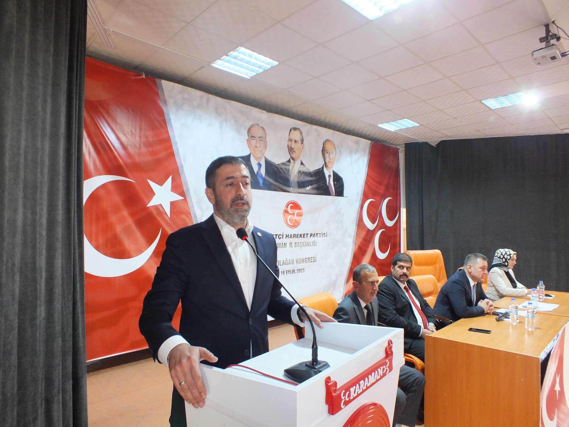 Bu sorumluluğu yerine getirmek ise; ölçüm, tespit ve planlamanın, doğruluğu temel alan isabetli bir çalışmayla gerçekleşebileceği tartışılmaz bir gerçektir. Temsilciliğini büyük bir heyecan ve şevkle yapacağımız Ülkücü Hareket, yerel siyasetteki rolü vesilesi ile de memleketimiz, bizlerden çok şeyler ummaktadır. Bu gerçekler doğrultusunda; Cumhuriyetimizin 2. yüzyılının inşa edileceği bu sürece ve partimizin vizyonuna yakışır bir kadroyla huzurlarınıza çıkıyoruz. Bugünün olduğu kadar geleceğin de partisi olan Milliyetçi Hareket Partisi’nin Karaman’daki bu kadroları, bütün hedeflerine ulaşmak için dinamik ve insanüstü bir çabayı ortaya koyacaktır. Kongremizden güçlenerek çıkmayı ve hepimize emanet edilen bu yüce davayı daha ileriye, daha başarılı menzillere ulaştırmayı hedefliyoruz. Bu hedeflerimizin; birlik ve beraberlik çerçevesinde gerçekleşeceğine dair inancımız da tamdır’’ diye söyledi. Tek liste ile seçime gidilen kongrede konuşmaların ardından oy verme işlemine geçildi.