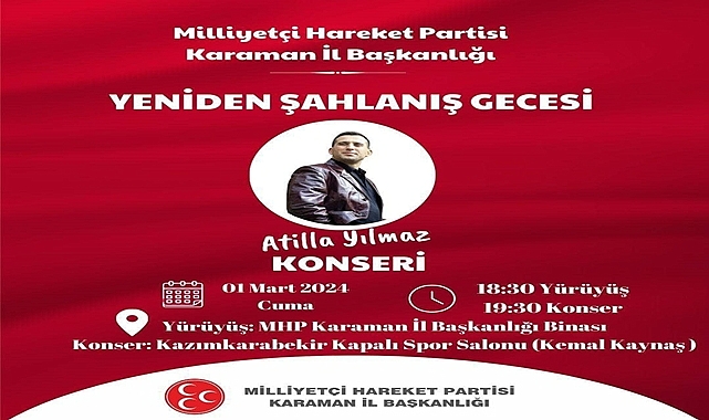 Milliyetçi Hareket Partisi Karaman İl Başkanlığı ''Yeniden Şahlanış Gecesi'' Düzenliyor''Yeniden Şahlanış Gecesi DavetiyesiDeğerli Hemşehrilerimiz,Milliyetçi Hareket Partisi Karaman İl Başkanlığı olarak, siz değerli dava arkadaşlarımızı ve tüm halkımızı, birlik, beraberlik ve coşkumuzu pekiştireceğimiz, geleceğe dair umutlarımızı yeniden yeşerteceğimiz bir akşamda bir araya gelmeye davet ediyoruz.Etkinlik Tarihi ve Saati: 1 Mart 2024, CumaYer: Kazımkarabekir Kapalı Spor Salonu, KaramanSaat 18.30'da, milli değerlerimizi ve birliğimizi simgeleyen coşkulu bir yürüyüşle başlayacak. Ardından, saat 19.30'da, partimizin değerli adaylarını tanıtacağımız bir programımız var. Geleceğimizi şekillendirecek adaylarımızla tanışma fırsatını kaçırmayın.Ve gecenin ilerleyen saatlerinde, sevilen sanatçımız Atilla Yılmaz'ın seslendireceği türkülerle, gönüllerimizi birleştireceğimiz, müzik ve kardeşliğin hakim olacağı unutulmaz anlar yaşayacağız.Bu özel gecede, Milliyetçi Hareket Partisi'nin kudretini, kararlılığını ve yeniden şahlanışını hep birlikte hissedeceğiz. Sizleri de aramızda görmekten onur duyarız.Gelin, bu tarihi geceyi birlikte yaşayalım, geleceğimizi birlikte inşa edelim.Saygılarımızla,Milliyetçi Hareket PartisiKaraman İl Başkanlığı'' ifadeleri kullanıldı.