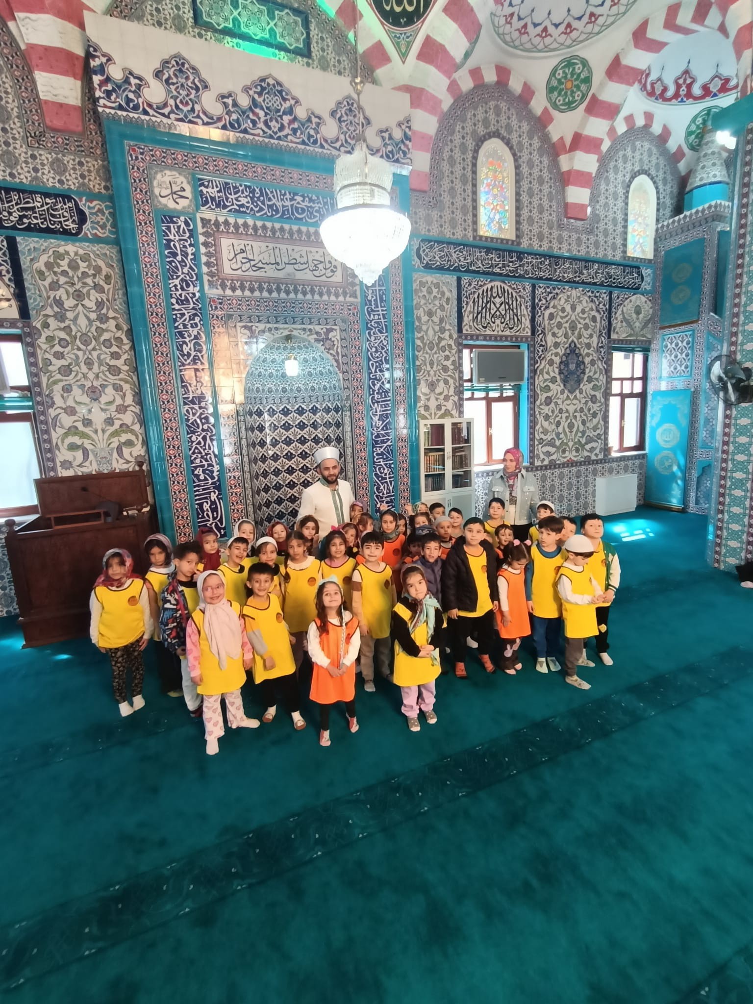 Minik Öğrencilerden Cami ZiyaretiGevher Hatun Anaokulu öğrencileri, öğretmenleri eşliğinde Kır Mahalle Büyük Camii’ni ziyaret etti. Camii görevlisi Musa Yıldız, minik misafirlere caminin tarihi ve önemi hakkında bilgi verdi. Öğrenciler, caminin mimari yapısını yakından inceleyerek merak ettikleri soruları sorma fırsatı buldu.Ziyaret sırasında öğrenciler, caminin manevi atmosferini deneyimleyerek keyifli vakit geçirdi. Namaz kılma ve dua etme gibi ibadetleri yerinde gözlemleyen minikler, cami adabını da öğrenmiş oldu. Eğitici ve keyifli geçen ziyaretin sonunda öğrenciler, edindikleri bilgileri öğretmenleriyle paylaşarak günün anlam ve önemini pekiştirdi.Gevher Hatun Anaokulu yetkilileri, bu tür etkinliklerin çocukların manevi değerleri öğrenmelerine katkı sağladığını belirterek benzer ziyaretlerin devam edeceğini ifade etti.