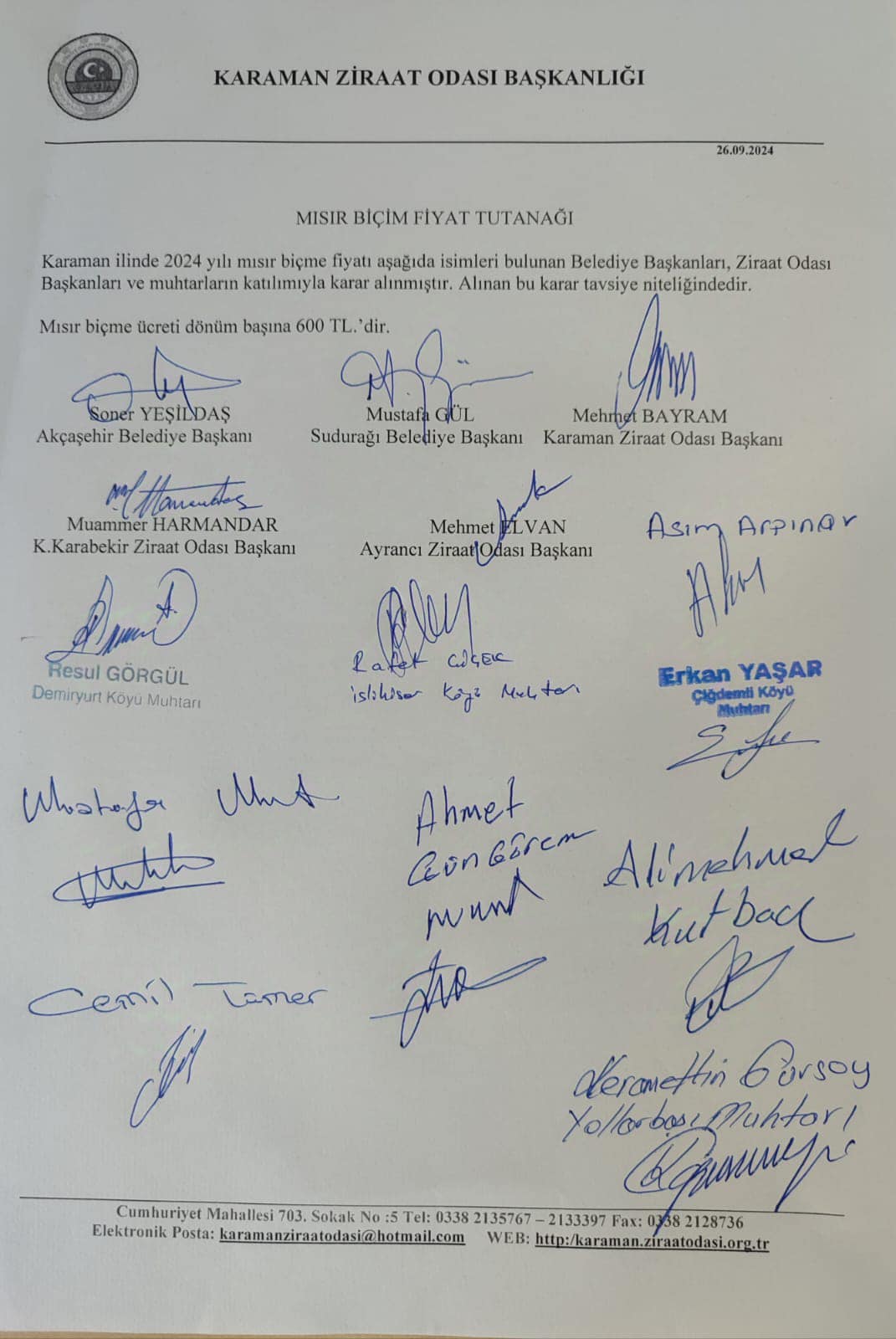 26 Eylül 2024 tarihinde Karaman Merkez Ziraat Odasında Karaman'daki çiftçilerimiz ve biçerdöver esnafımızın talepleri doğrultusunda 2024 Mısır biçim fiyatlarını belirlemek üzere bir toplantı gerçekleştirdi.