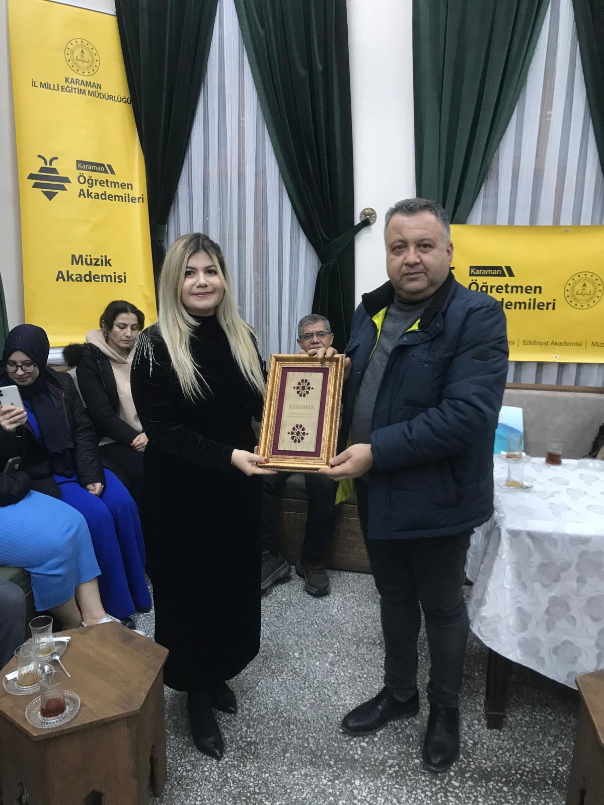 Program sonunda Karaman Güzel Sanatlar Lisesi Müdürü Özgür Havuçcu, bu anlamlı etkinlik için Eğitimci ve Sanatçı Feyzanur Okur ile Fatih Anadolu Lisesi öğrencilerine teşekkürlerini dile getirerek Feyzanur Okur’a hediye takdim etti.