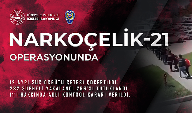 İçişleri Bakanı Ali Yerlikaya; Uyuşturucu Satıcılarına yönelik son 3 gündür Adana Emniyet Müdürlüğünce düzenlenen “NARKOÇELİK-21” operasyonlarında 12 ayrı uyuşturucu suç çetesi çökertildiğini ve Operasyonlarda uyuşturucu suç çete üyesi 282 şüpheli yakalandığını ayrıca 266’sı tutuklandığını açıkladı. 11’i hakkında adli kontrol kararı verildi. Aziz Milletimizin Bilmesini İsterim ki; Ülkemizi zehir tacirlerinden ve sokak satıcılarından temizlemeye kararlıyız. Ülkemizin dört bir yanında zehir tacirlerine karşı operasyonlarımız kararlılıkla devam edecek! '' ifadelerinde bulunan Bakanımız Sayın Ali Yerlikaya sosyal medya hesabından yaptığı paylaşımda ayrıca şu ifadelere yer verdi; Adana Valiliği, Adana Cumhuriyet Başsavcılığı ve Emniyet Genel Müdürlüğü Narkotik Suçlarla Mücadele Başkanlığı koordinesinde; Adana İl Emniyet Müdürlüğü Narkotik Suçlarla Mücadele Şube Müdürlüğünce yapılan çalışmalar sonucu;