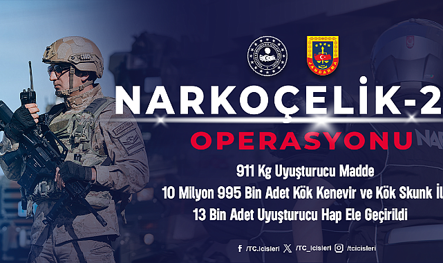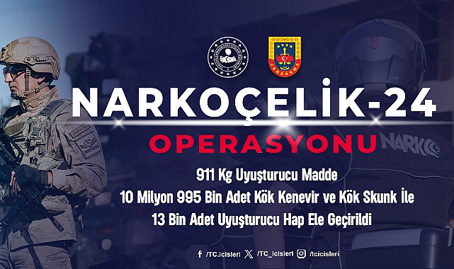 İçişleri Bakanı Sayın Ali Yerlikaya, uyuşturucu madde imalatçılarına, bunların satışını yapanlara ve sokak satıcılarına yönelik düzenlenen "NARKOÇELİK-24" operasyonlarının sonuçlarını açıkladı. Jandarma tarafından 13 ilde gerçekleştirilen operasyonlarda toplamda 911 kg uyuşturucu madde, 10 milyon 995 bin adet kök kenevir ve kök skunk ile 13 bin adet uyuşturucu hap ele geçirildi. Operasyonlarda 83 zehir taciri ve sokak satıcısı yakalanırken, 28'i tutuklandı, 17'si adli kontrol kararı ile serbest bırakıldı ve 5'inin işlemleri sürüyor. Bakanımız Sayın Ali Yerlikaya'nın Açıklamaları: