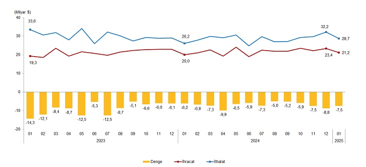 Ocak ayında dış ticaret açığı bir önceki yılın aynı ayına göre %21,9 artarak 6 milyar 185 milyon dolardan, 7 milyar 538 milyon dolara yükseldi. İhracatın ithalatı karşılama oranı 2024 Ocak ayında %76,4 iken, 2025 Ocak ayında %73,7'ye geriledi.