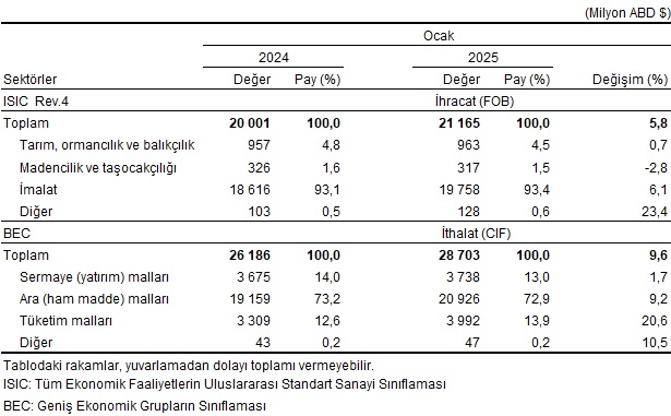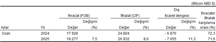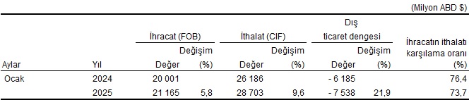 Türkiye İstatistik Kurumu ile Ticaret Bakanlığı iş birliğiyle genel ticaret sistemi kapsamında üretilen geçici dış ticaret verilerine göre; ihracat 2025 yılı Ocak ayında, bir önceki yılın aynı ayına göre %5,8 artarak 21 milyar 165 milyon dolar, ithalat %9,6 artarak 28 milyar 703 milyon dolar olarak gerçekleşti.