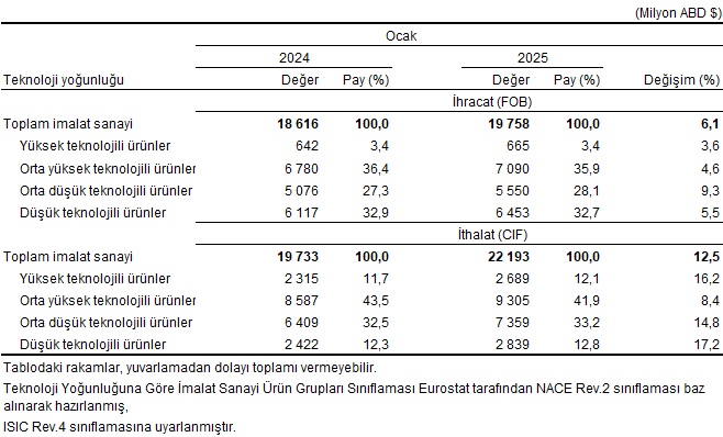 Teknoloji yoğunluğuna göre imalat sanayi ürünleri dış ticareti, Ocak 2025