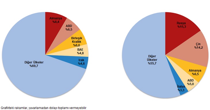 Ocak ayında ihracatta ilk sırayı Almanya aldı. Almanya'ya yapılan ihracat 1 milyar 782 milyon dolar olurken, bu ülkeyi sırasıyla; 1 milyar 371 milyon dolar ile ABD, 1 milyar 280 milyon dolar ile Birleşik Krallık, 1 milyar 12 milyon dolar ile Birleşik Arap Emirlikleri, 979 milyon dolar ile Irak takip etti. İlk 5 ülkeye yapılan ihracat, toplam ihracatın %30,3'ünü oluşturdu.