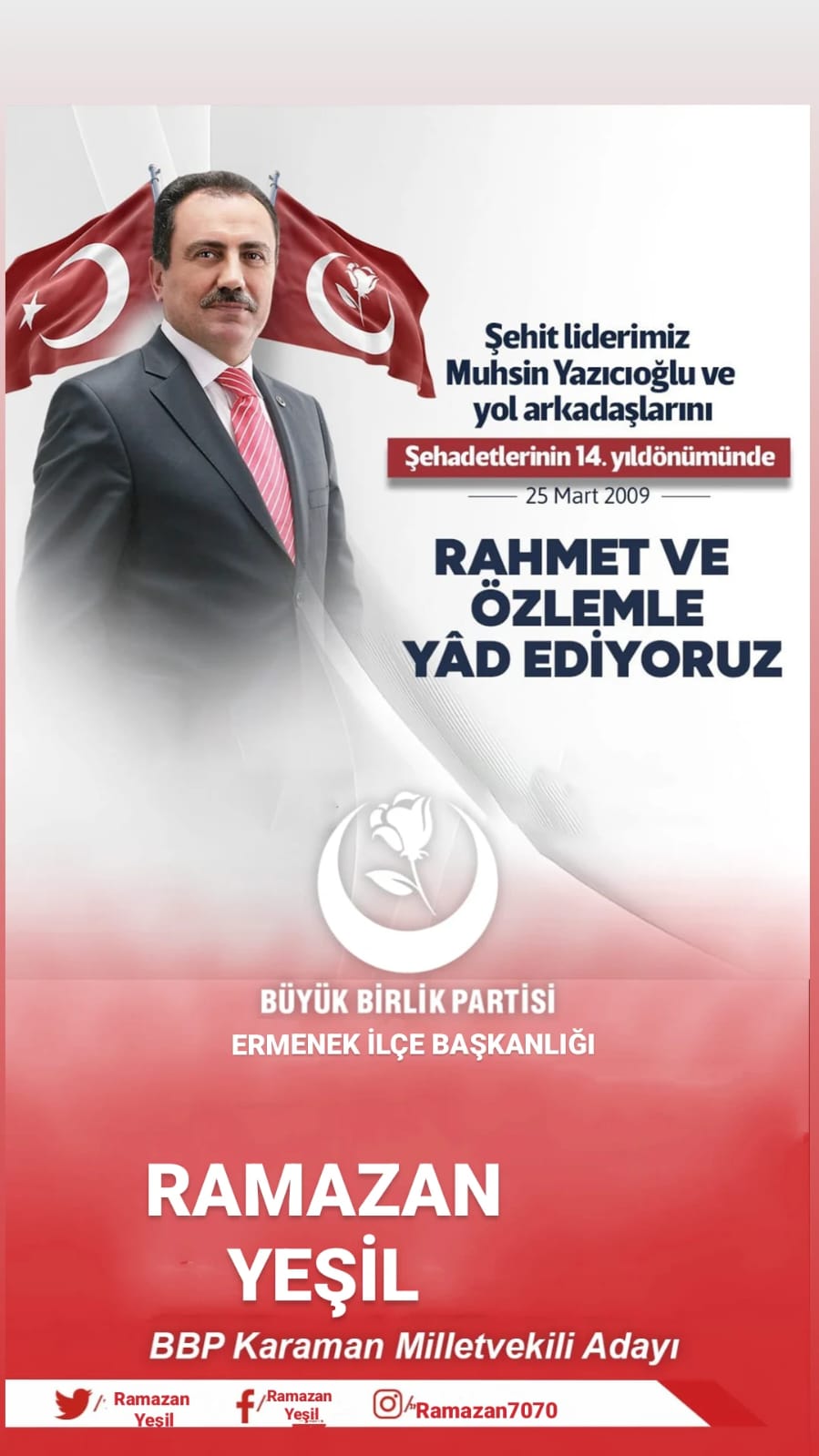 Büyük Birlik Partisi Karaman Milletvekili adayı Ramazan Yeşil, yaşadığı elim bir helikopter kazası sonucu hayatını kaybeden Muhsin Yazıcıoğlu'nun ölüm yıldönümü nedeniyle bir anma mesajı yayımladı.