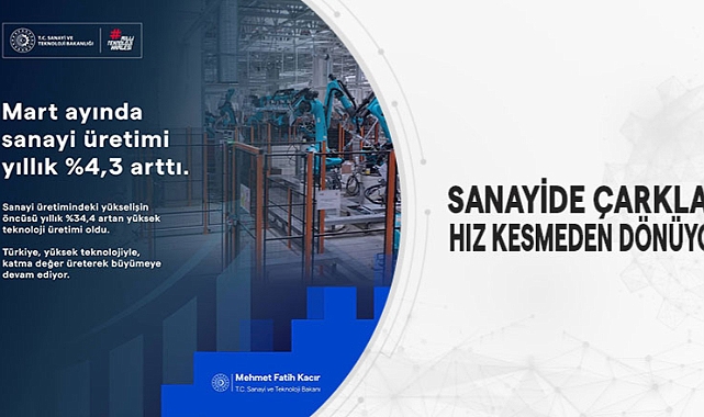 Sanayi ve Teknoloji Bakanı Mehmet Fatih Kacır, Türk sanayisinde çarkların hız kesmeden döndüğünü belirterek, “En fazla yükseliş, yıllık yüzde 34,4 artan yüksek teknoloji üretiminde gerçekleşti. Bu göstergeler; Milli Teknoloji Hamlesi hedeflerimizde doğru yolda ilerlediğimizin göstergesi. Türkiye, yüksek teknolojiyle katma değer üreterek yoluna devam ediyor.” dedi.