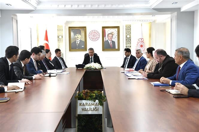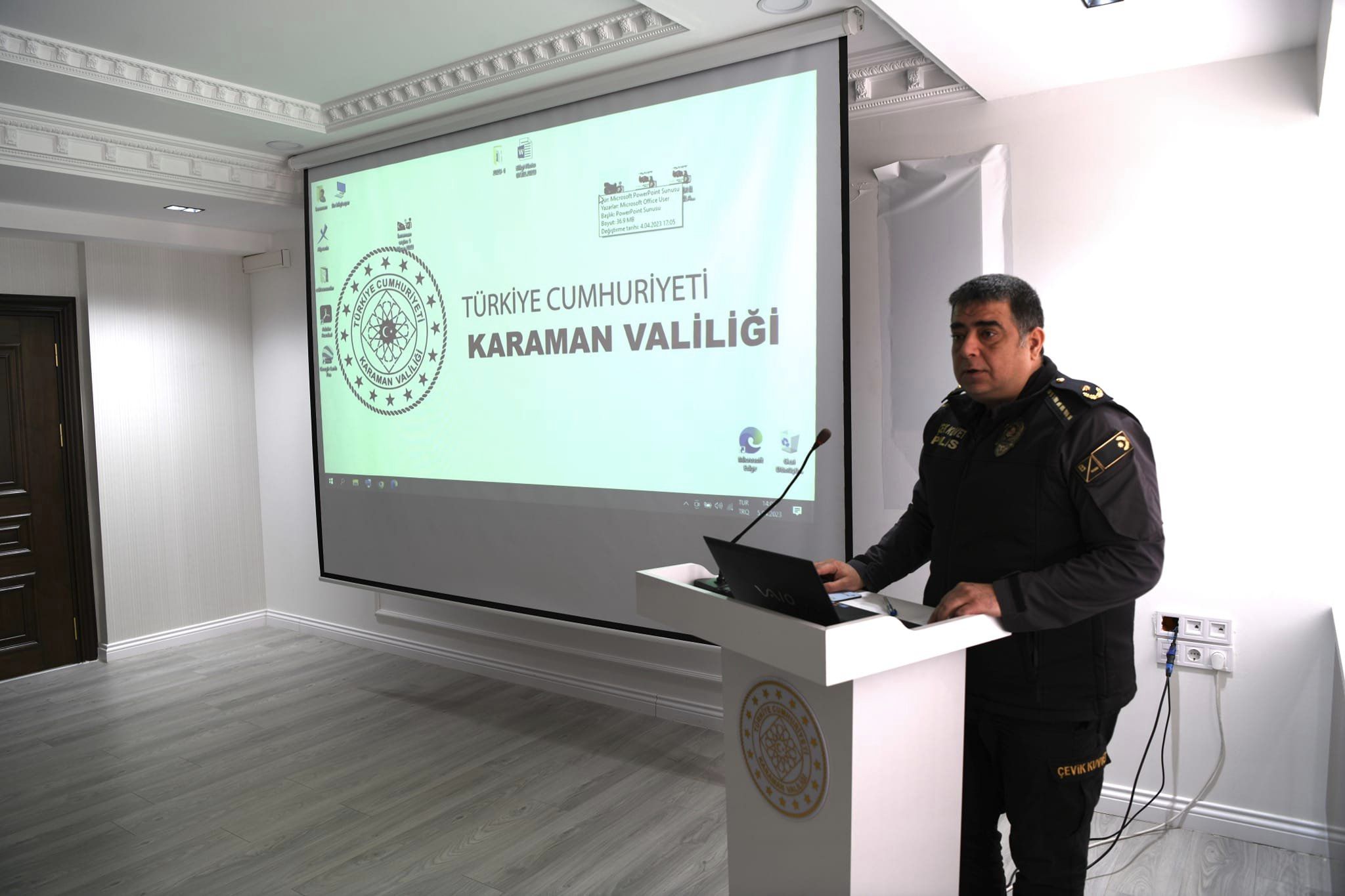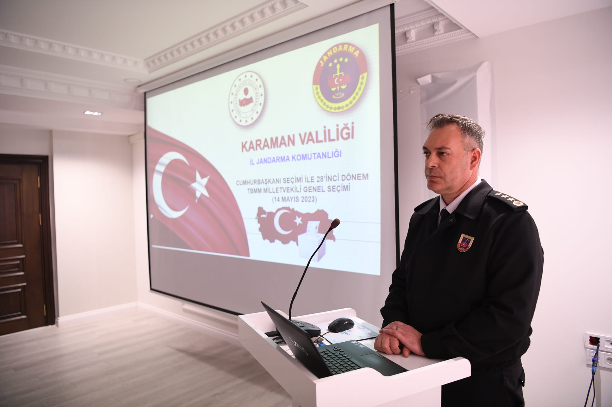 Yunus Emre Toplantı Salonunda yapılan toplantıda, Karaman İl Emniyet Müdürlüğü ve İl Jandarma Komutanlığı tarafından seçim güvenliğine ilişkin alınacak tedbirler konusunda bilgilendirme sunumu yapıldı.