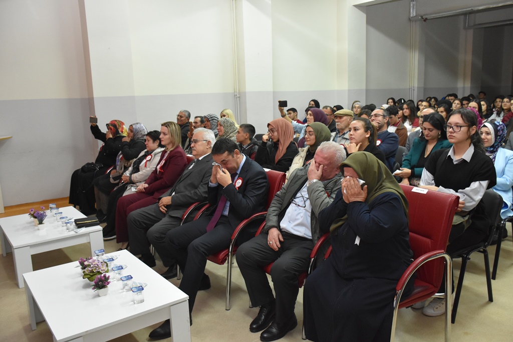 Şehit Öğretmen Hamza Çetin ve şehit öğretmenler anısına öğretmen ve öğrencilerin birlikte hazırlamış oldukları video gösterimi davetlilere duygu dolu anlar yaşatırken Şehit Öğretmen Hamza Çetin’in aile fertleri ve davetliler gözyaşlarını tutamadı.