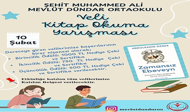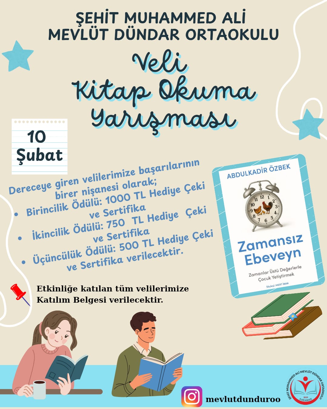 Karaman’da bulunan Şehit Muhammed Ali Mevlüt Dündar Ortaokulu tarafından, aile–okul iş birliğini güçlendirmek, ebeveynlik üzerine birlikte düşünmek ve kitap okumanın önemine dikkat çekmek amacıyla “Zamansız Ebeveyn” kitabı ile Kitap Okuma Yarışması düzenleniyor.