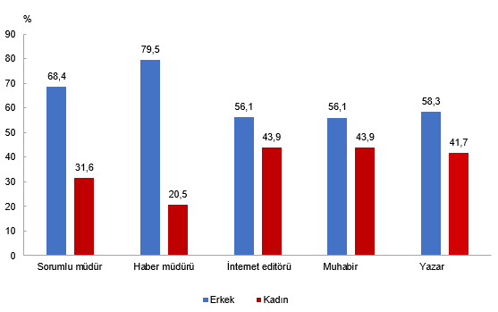 Resmi ilan yayımlayan internet haber sitelerinde çalışanların kadro unvanına ve cinsiyete göre dağılımı (%), 2024