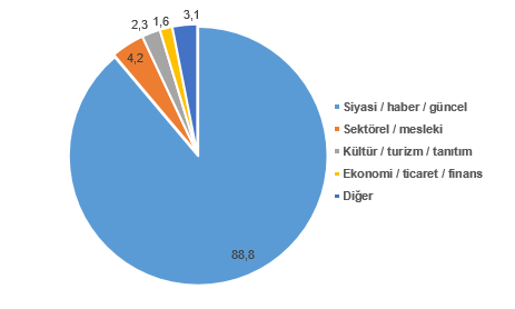 Toplam 2 bin 40 süreli yayının %88,8'i siyasi/haber/güncel, %4,2'si sektörel/mesleki, %2,3'ü kültür/turizm/tanıtım, %1,6'sı ekonomi/ticaret/finans içerikli yayımlanırken, %3,1'i ise diğer içerik türlerinde yayımlanmıştır.