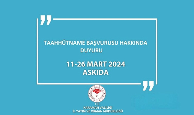 TAAHHÜTNAME BAŞVURULARI ASKIDA27 Mayıs 2014 tarih ve 29012 sayılı Resmi Gazetede yayımlanarak yürürlüğe giren Çiftçi Kayıt Sistemi Yönetmeliği ile 18/11/2023 tarih ve 32373 sayılı Resmi Gazete'de yayımlanarak yürürlüğe giren Çiftçi Kayıt Sistemi Yönetmeliğinde Değişiklik yapılmasına dair Yönetmeliğin 3. Maddesinin (L) bendinde “Taahhütnameye konu arazilere ilişkin ÇKS kayıtları üretim yılının Mart ayı içerisinde on beş gün süreyle il/ilçe müdürlükleri ve muhtarlıklarda askıya çıkarılmak suretiyle ilan edilir.” hususu belirtilmektedir. Listede bulunan köy/mahallelerde müracaat eden çiftçilerin bilgileri İl Müdürlüğümüz tarafından Bakanlığımız Tarım Bilgi Sistemi, Çiftçi Kayıt Sistemi’ne aktarılmış olup, sistem vasıtasıyla oluşturulan İcmaller 11 Mart - 26 Mart 2024 tarihleri arasında 15 (on beş) gün süreyle askıya çıkartılmıştır. İcmal Listesine https://karaman.tarimorman.gov.tr/.../Taahhutname... sayfamızdan ulaşabilirsiniz.