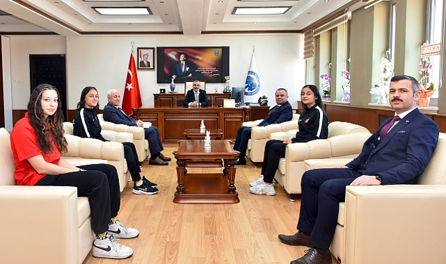 Madalyaları ile birlikte Rektör Prof. Dr. Mehmet Gavgalı’yı ziyaret eden öğrencilere Spor Bilimleri Fakültesi Dekanı Prof. Dr. Sefa Lök ile Genel Sekreter Ahmet Tüfekci eşlik etti.