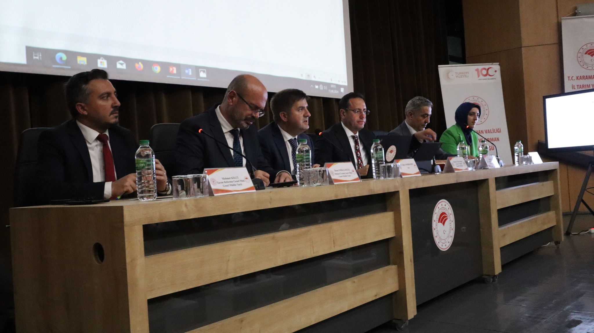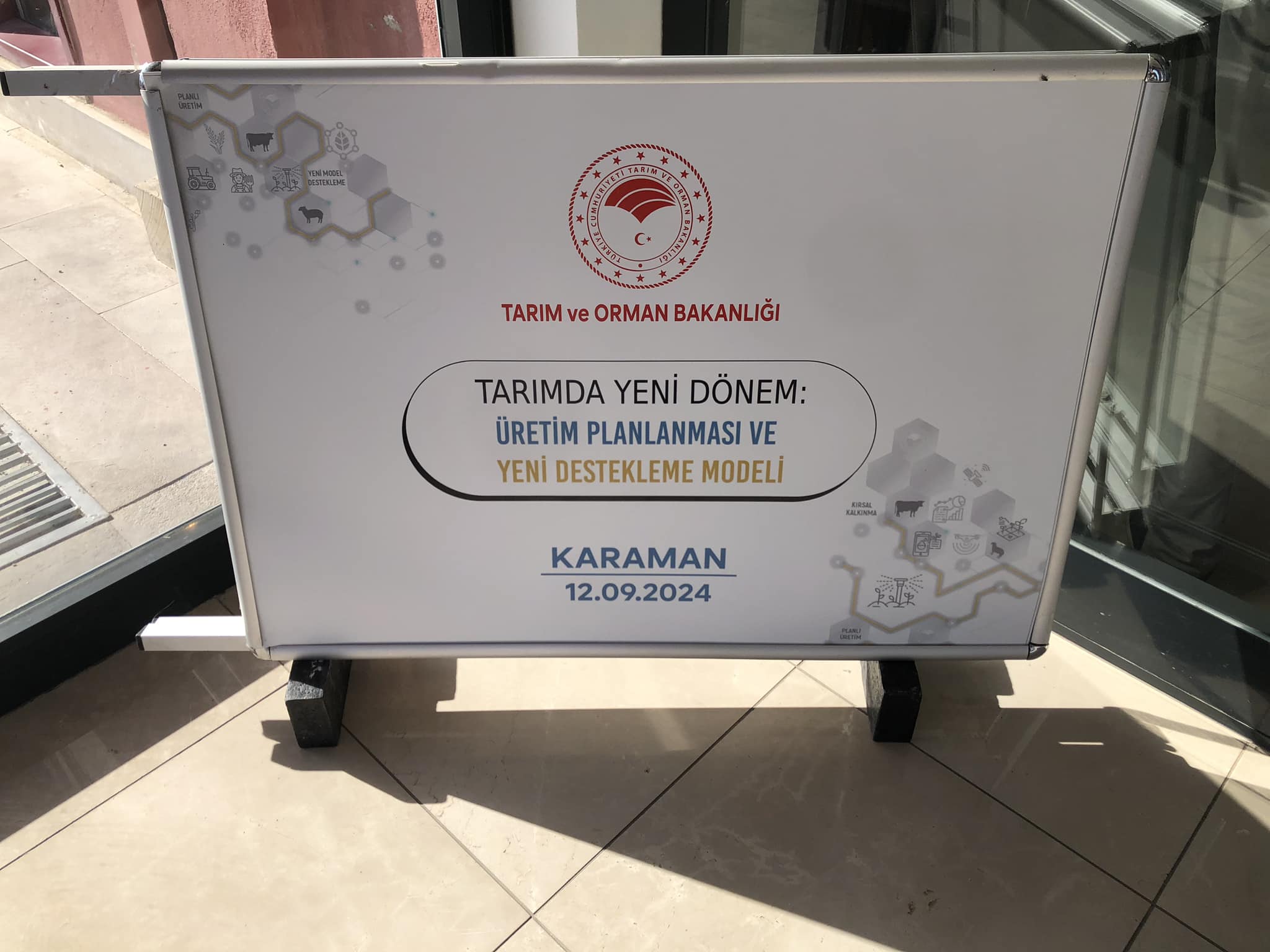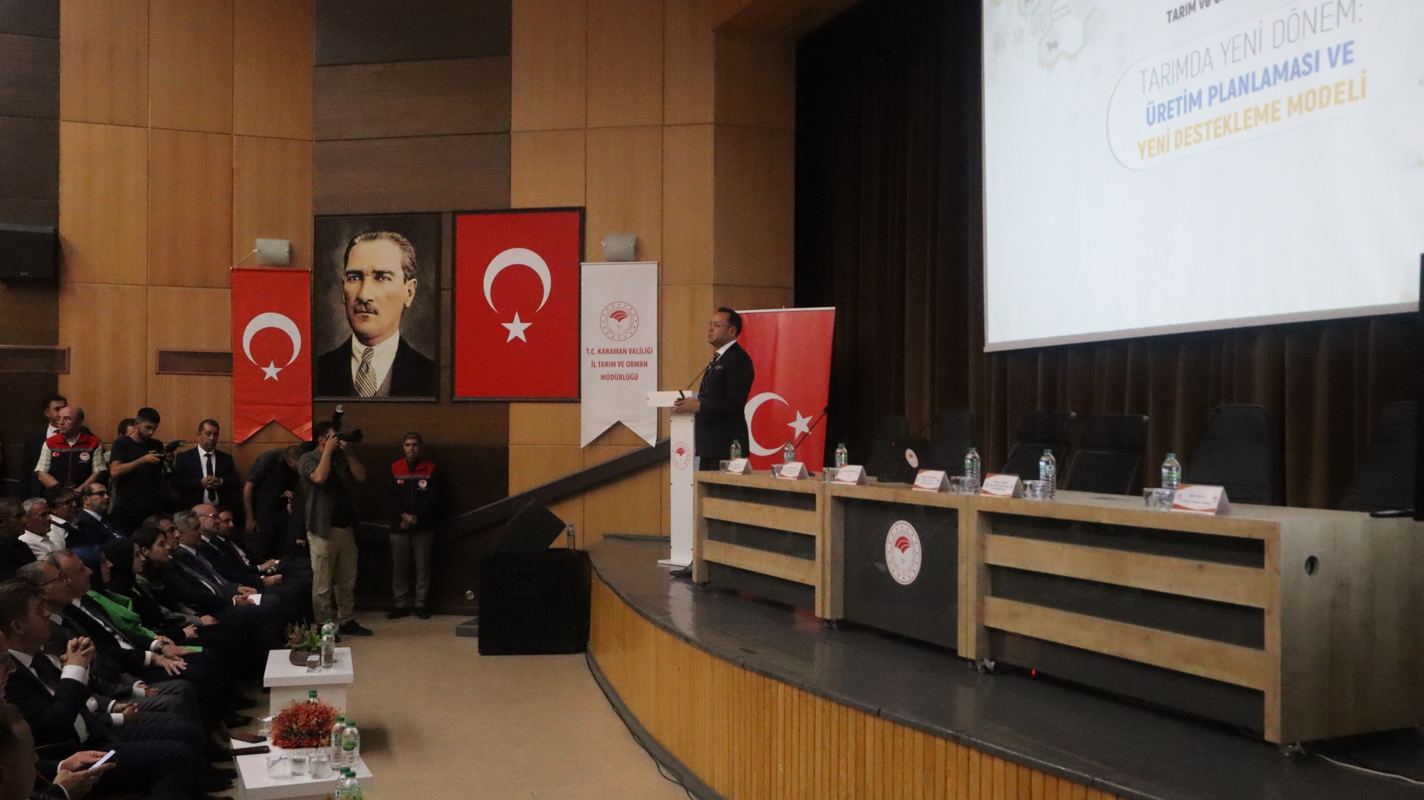 TARIMDA YENİ DÖNEM;Bakanlığımız tarafından bu yıl uygulanmaya koyulan Tarımsal üretim planlaması ile 2025-2027 yılları arasında uygulanacak olan yeni destekleme modelinin bilgilendirme toplantısı 12.09.2024 tarihinde Pirireis Kültür Merkezinde Karaman Valisi Sayın H.Engin Sarıibrahim'in ev sahipliğinde Tarım ve Orman Bakan Yardımcısı Sayın Ebubekir Gizligider'in teşrifleri ile yapıldı.Pirireis Kültür Merkezinde saat 17.30'da başlayan toplantıya İl Merkezi ve İlçelerimizden yoğun bir katılım oldu. İl Müdürü Hatice Bulut'un açılış konuşması ile başlayan toplantı Bakan Yardımcımızın yaptığı sunum sonrasında Bakan Yardımcısı Ebubekir Gizligider, Karaman Valisi H.Engin Sarıibrahim, Hayvancılık Genel Müdürlüğü Genel Müdür Yardımcısı Melikşah Taşkın, Bitkisel Üretim Genel Müdürlüğü Genel Müdür Yardımcısı İhsan Emiralioğlu, Tarım Reformu Genel Müdürlüğü Genel Müdür Yardımcısı Mehmet Kilci ve İl Müdürü Hatice Bulut'un üreticilerimizden gelen soruları cevaplaması ile son buldu.
