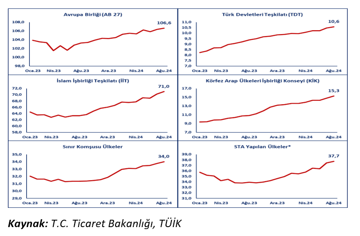 - Türk Devletleri Teşkilatı (TDT) ülkelerine yapılan ihracat %11,8 artışla (741 milyon dolar artış) 7,0 milyar dolara yükselerek söz konusu dönemde gerçekleştirilen en yüksek ihracat değerlerine ulaşmıştır.